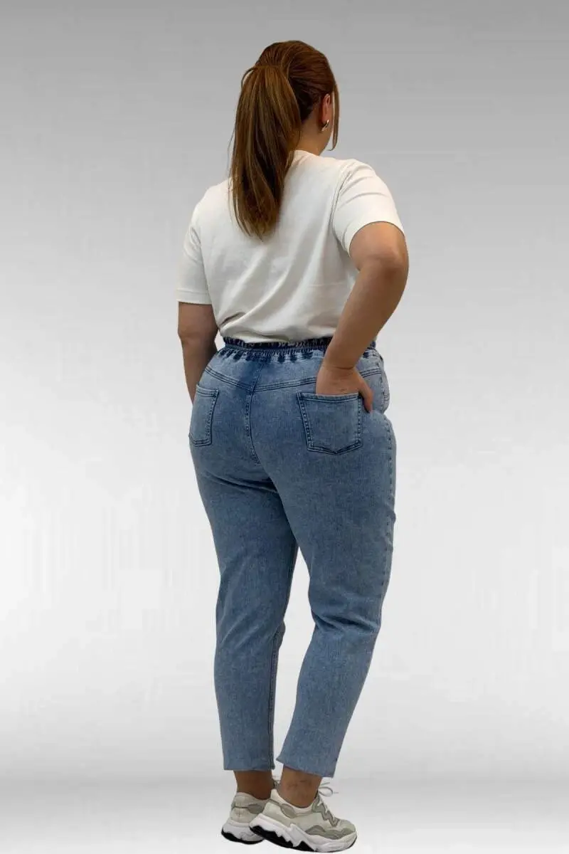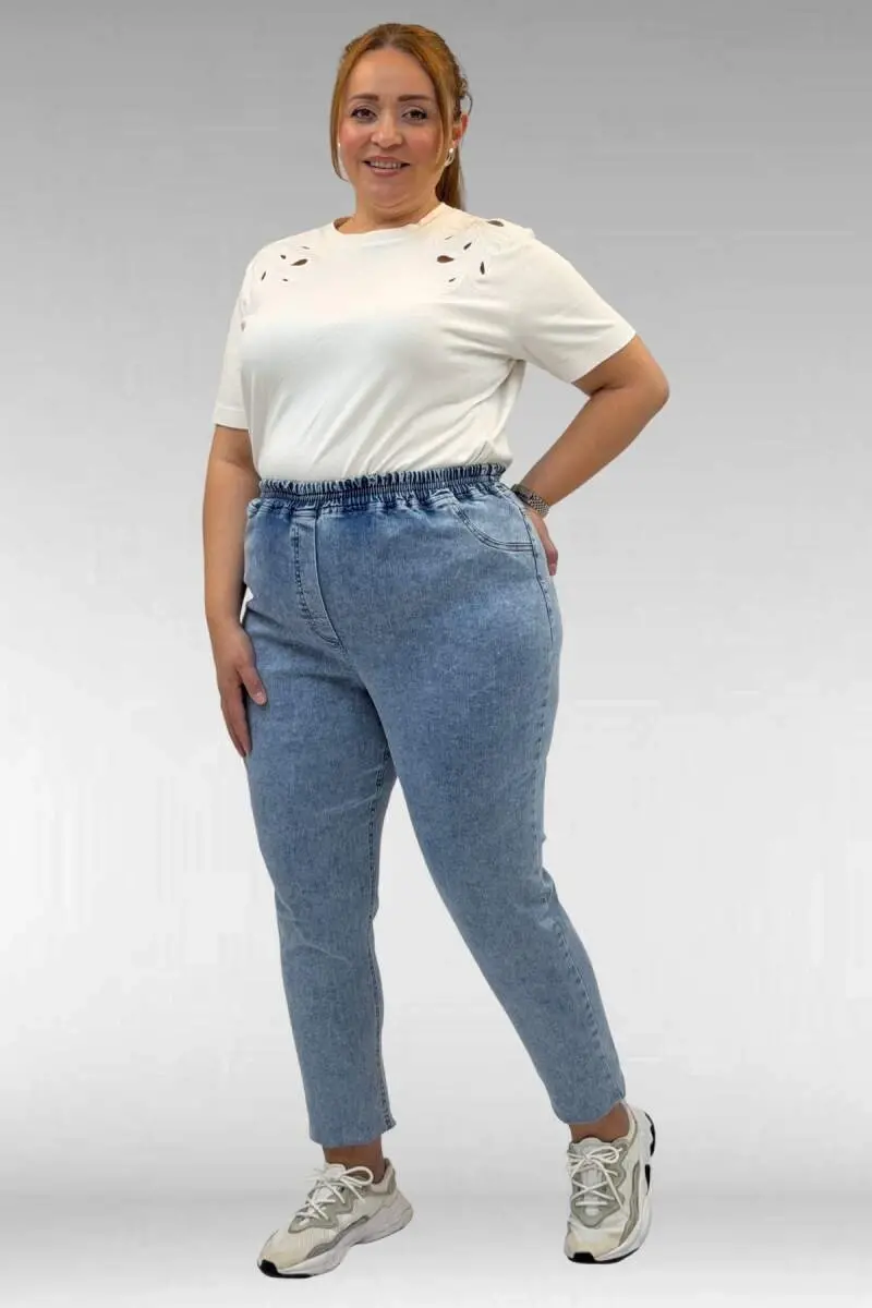 69002 Büyük Beden Beli Lastikli Darpaça Uzun Kot Pantolon - Kar Yıkama Mavi