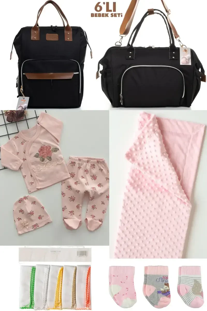 6’LI BEBEK DOĞUM SETİ(HASTANE ÇIKIŞ,ANNE&BEBEK BAKIM OMUZ VE SIRT ÇANTASI,BATTANİYE,ÇORAP VE MENDİL)-SİYAH