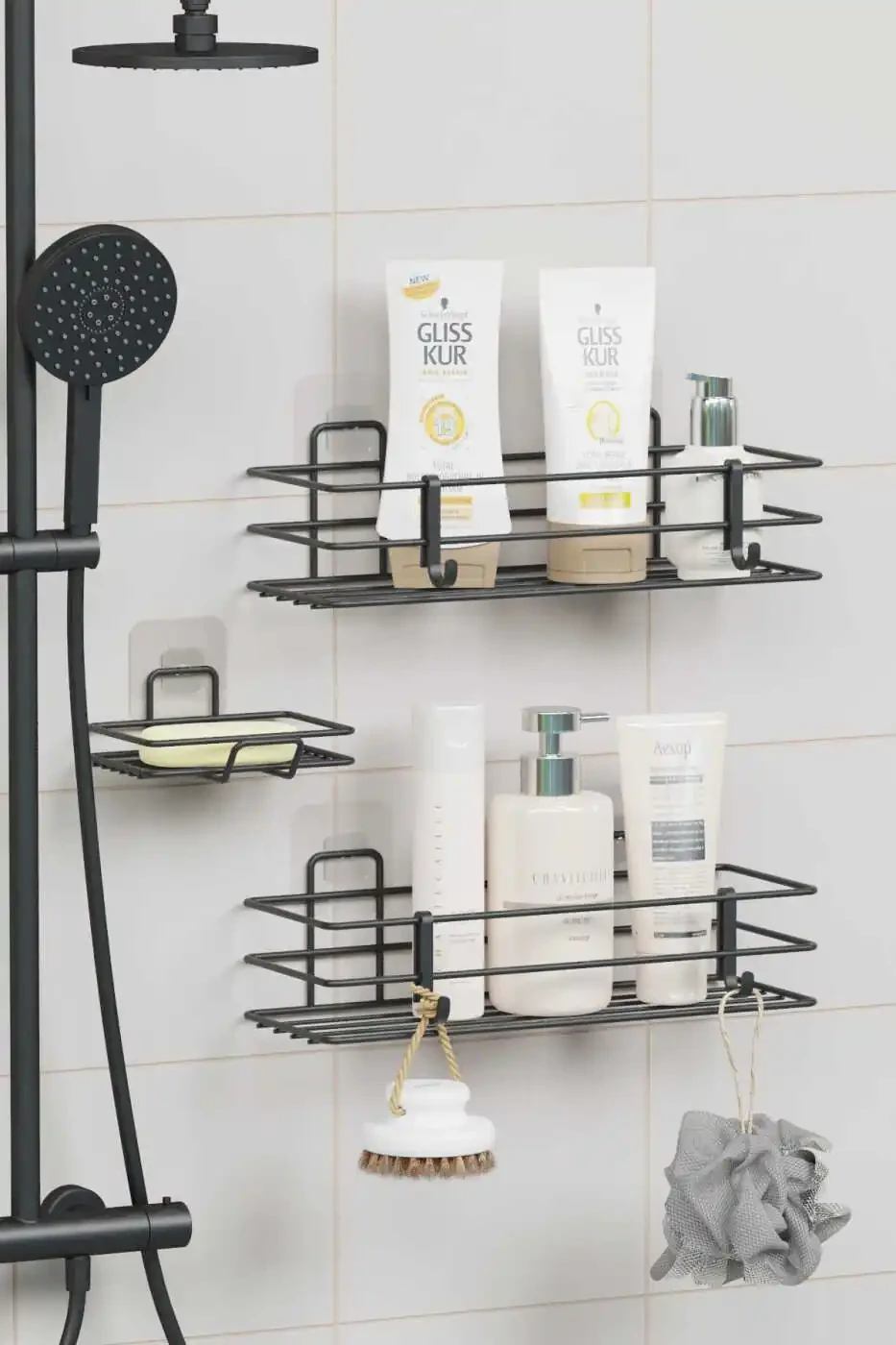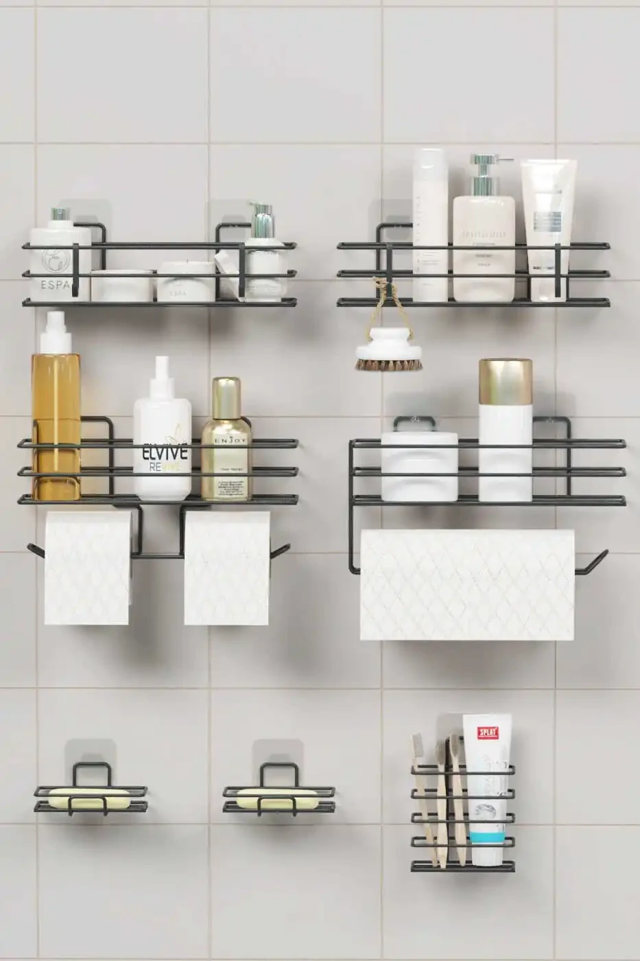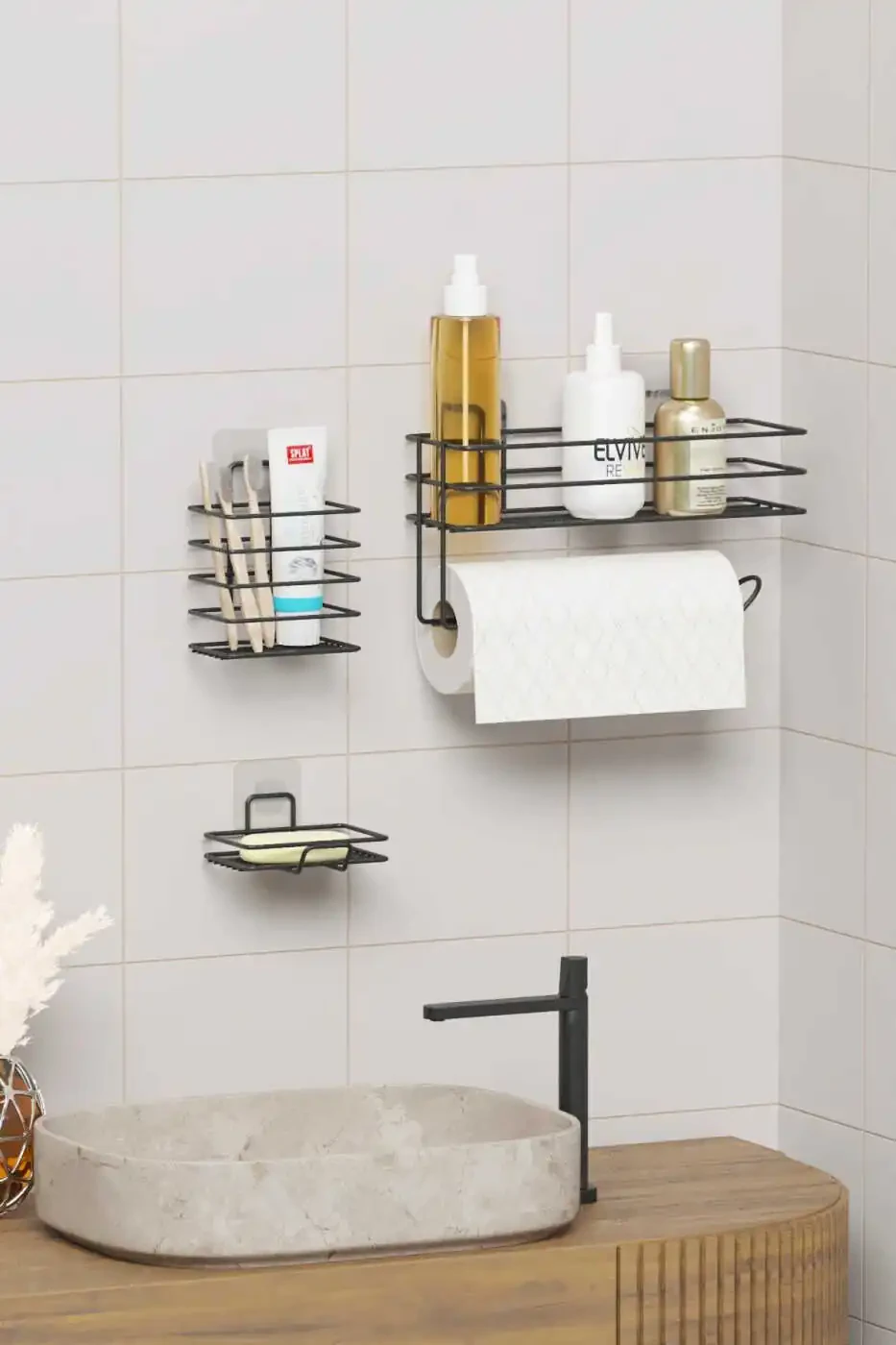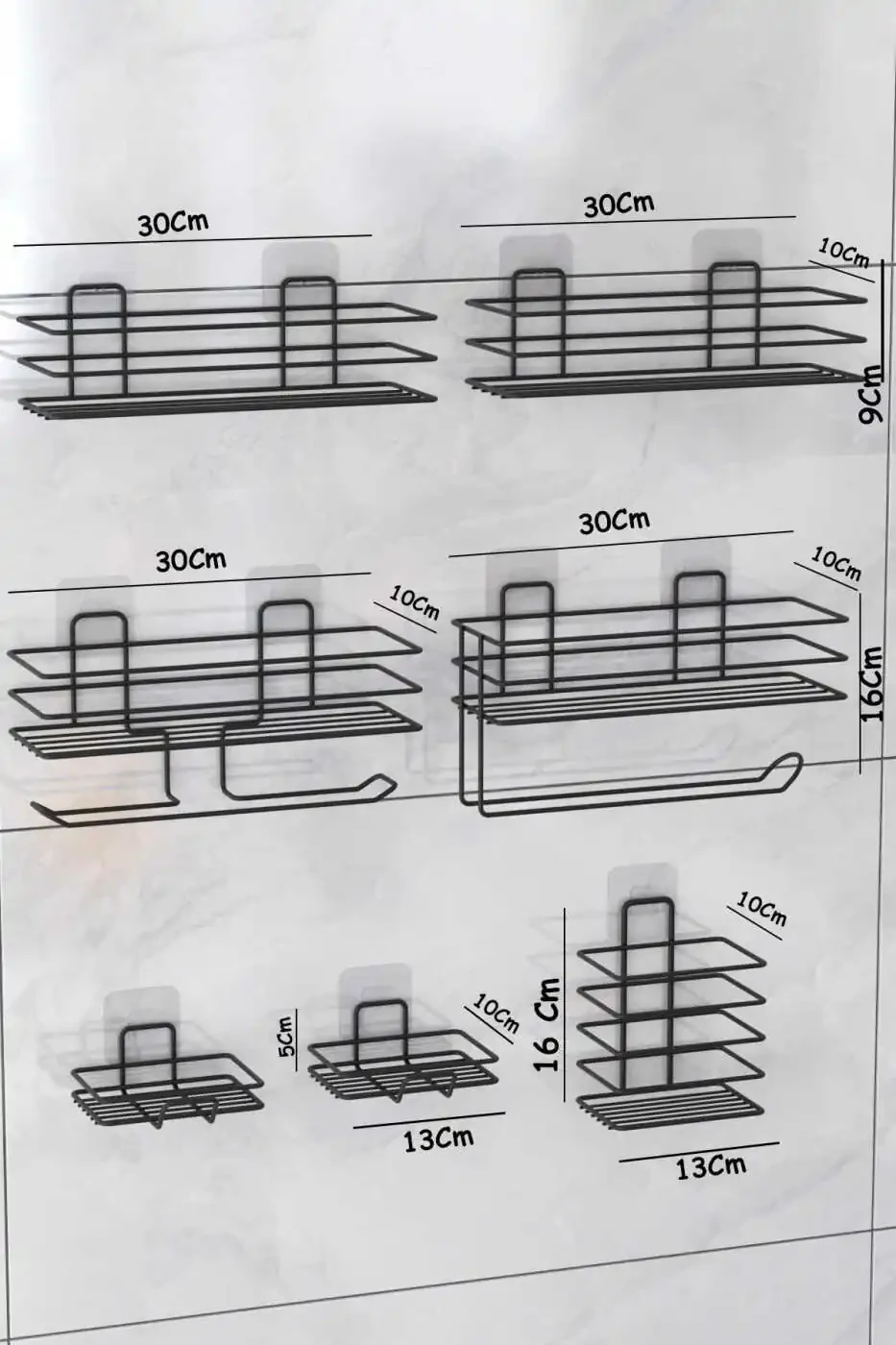 7 Piece Adhesive Full Bathroom Set Shower Shelf Towel Holder Soap Dish Toothbrush Holder Bathroom Organizer Bathroom Accessory SetProduct DescriptionMeet the 7 Piece Adhesive Full Bathroom Set, designed to make your bathroom tidy and stylish! This comprehensive set will meet all your basic needs in your bathroom and help you use your space most efficiently. This set, which includes essential pieces such as a shower shelf, towel rack, soap dish, and toothbrush holder, allows you to have everything you need in your bathroom at your fingertips. Thanks to its adhesive feature, it can be easily mounted without the need for any drilling or screwing, thus protecting your walls and saving you time. While organizing your belongings with its bathroom organizer feature, it also offers elegance and functionality together as a bathroom accessory set. Made of high-quality materials, this set offers long-lasting use while adding an aesthetic touch to your bathroom with its modern and elegant design. Every detail has been carefully considered in this set, which will make your bathroom a pleasant part of your personal care routine. Say goodbye to messy and complicated bathrooms! Experience the privilege of having a tidy, stylish, and useful bathroom with the 7 Piece Adhesive Full Bathroom Set.Product Features* 7-piece full bathroom set: Includes shower shelf, towel rack, soap dish, toothbrush holder, and other accessories.* Adhesive mounting: Requires no drilling or screwing, easy to mount.* Bathroom organizer: Helps you organize your belongings.* High-quality material: Provides long-lasting and durable use.* Modern design: Adds a stylish and aesthetic look to your bathroom.* Useful and practical: Meets your bathroom needs and offers ease of use.* Wall protector: Does not damage your walls thanks to its adhesive feature.Additional InformationThe product is easy to clean, you can ensure hygiene by wiping it with a damp cloth. Different color options are available, you can choose the one that suits your bathroom's decoration. Assembly instructions are included in the box. Make sure the adhesive surfaces are clean and dry before installation.
