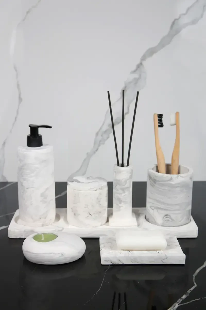 - Katı sabunluk, sıvı sabunluk, diş fırçalık, mumluk, tepsi, sunumluk ve pamuk kutusu içerir