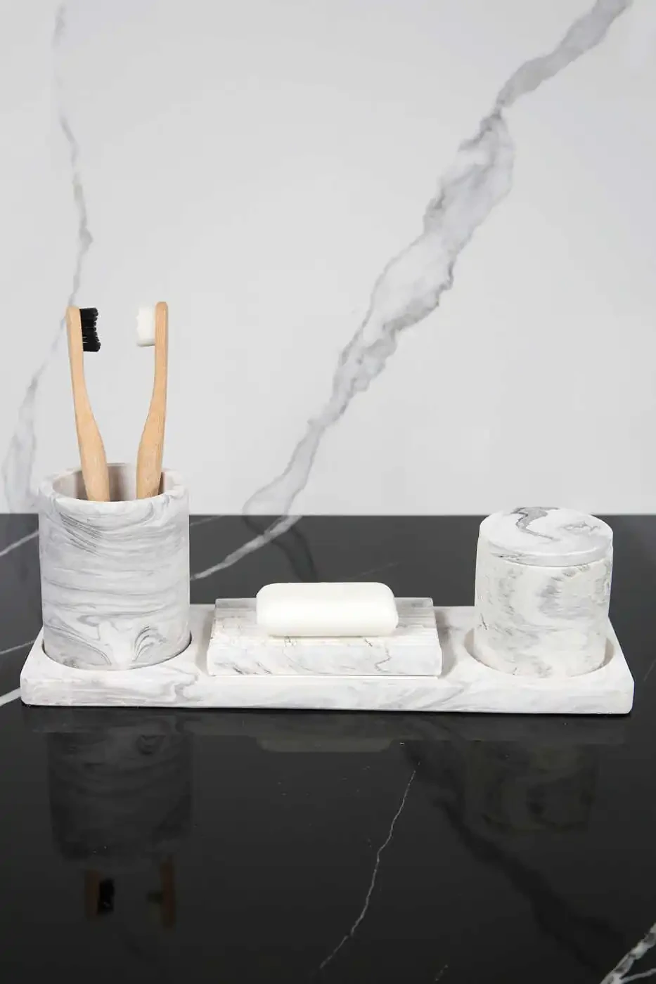 Meet the 8-piece concrete bathroom set that will add a modern and stylish touch to your bathroom! This elegant set is made of durable and aesthetic concrete material. The set includes; a tray, a toothbrush holder, a solid soap dish, a liquid soap dispenser, a cotton swab box and its lid, an incense holder and a stone candle holder. Each piece is carefully designed and thought out to bring together all the accessories you might need in your bathroom. The natural and industrial look of concrete adds a sophisticated touch to your bathroom, while the set's functional design makes your daily use easier. It allows you to neatly store your liquid soap and toothbrush, keep your solid soap dry, keep your cotton swabs hygienically, and create a relaxing atmosphere with your candles and incense. The tray keeps all these pieces together, providing a tidy and stylish look in your bathroom. This 8-piece concrete bathroom set is a perfect way to personalize your bathroom and add a modern touch to it. It is an ideal gift option for both yourself and your loved ones. With its durable structure, this set, which you can use for many years, will be one of the indispensable parts of your bathroom.