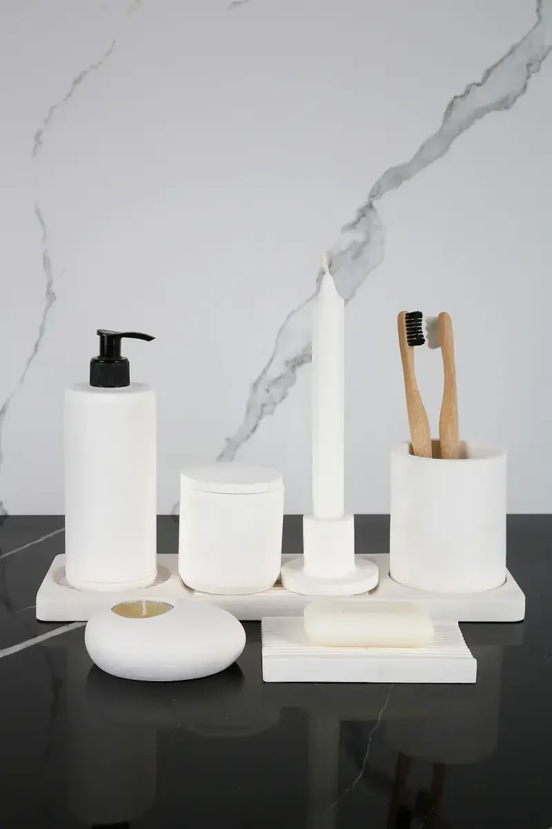 The durability and long-lasting structure of concrete ensure that you can use this bathroom set for many years. Each piece is carefully designed and manufactured. The timeless elegance of the white color easily adapts to your bathroom's decoration and always offers a modern look. This set not only organizes your bathroom but also helps you create a personal touch in your bathroom. The 8-Piece Concrete Bathroom Set is the perfect choice to feel special and create a relaxing atmosphere in your bathroom.