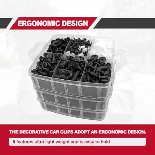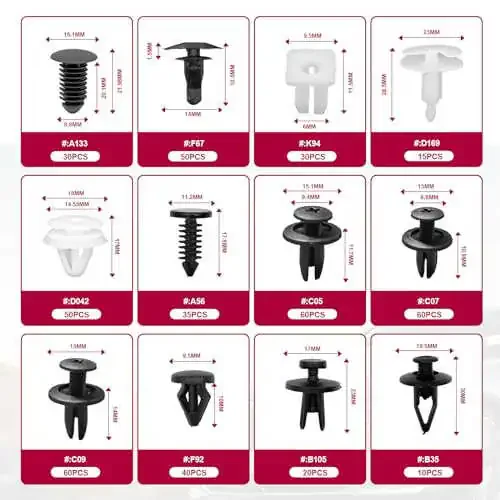 To'plam oson kirish va tashkil etish uchun shaffof qutida keladi. Bu kerakli klipni tez va oson topish imkonini beradi. Avtomobil ta'mirlashni osonlashtirish va avtomobilingizning asl ko'rinishini saqlash uchun ideal to'plamdir.