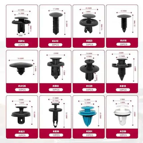 Avtomobilingizning bekatish panellarini va boshqa qismlarini ta'mirlash yoki almashtirish uchun kerak bo'lgan hamma narsaga ega bo'lgan bu 801 dona avtomobil ushlash kliplari to'plami bilan vaqt va puldan tejang. Eng mashhur 24 o'lchamda bo'lgan bu keng qamrovli to'plam Toyota, GM, Ford, Honda, Chevy, Acura, Chrysler va Mazda kabi ko'plab avtomobil markalari va modellarida uchraydigan turli xil kliplarni o'z ichiga oladi.