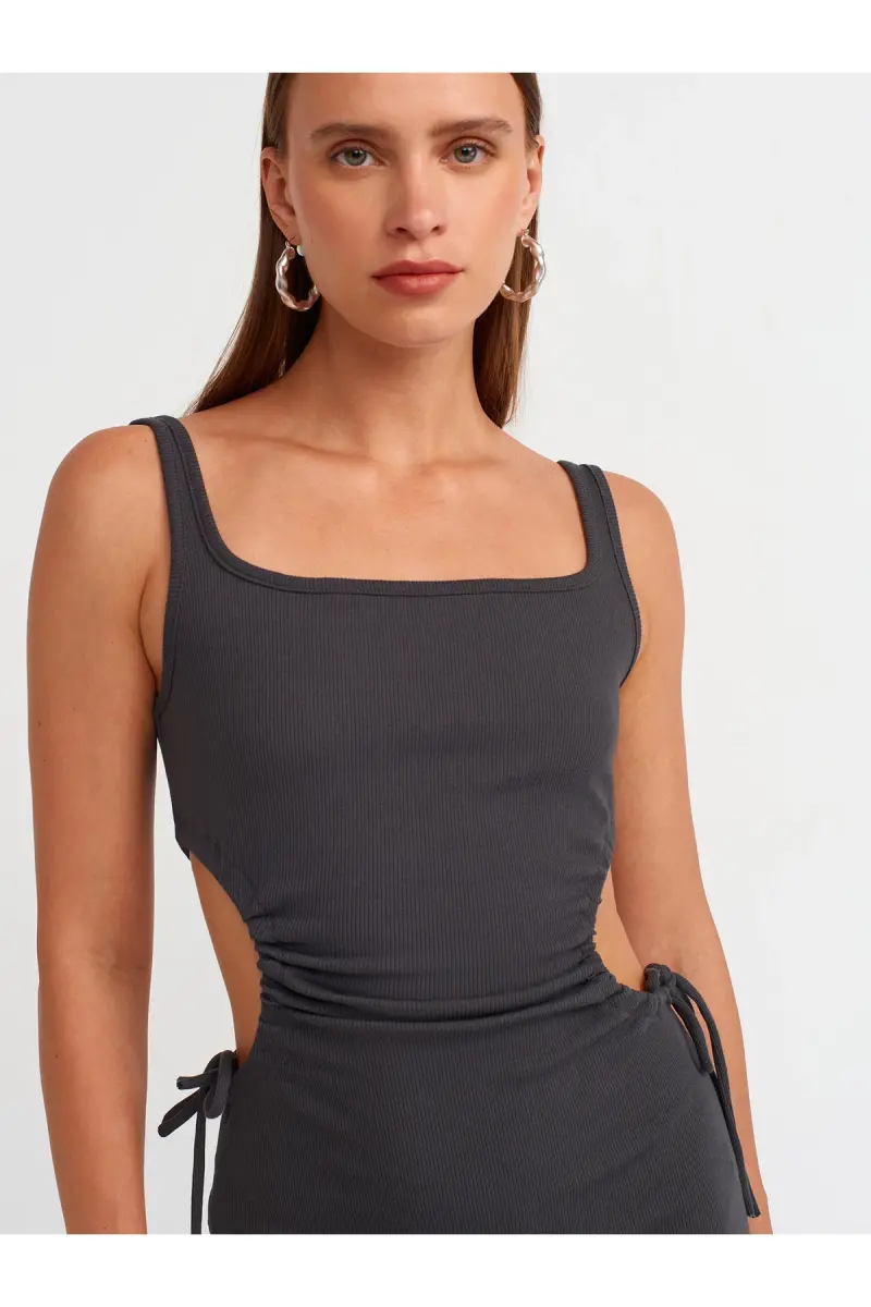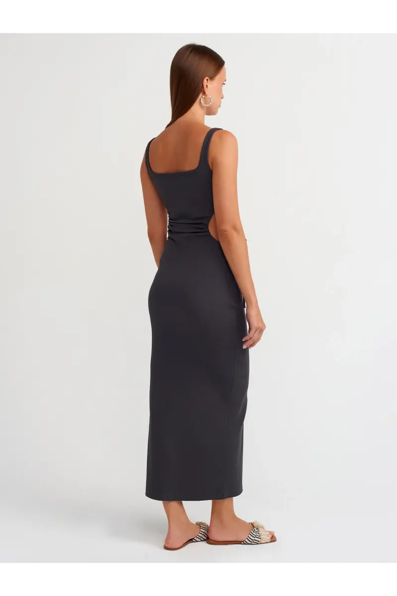 9094 Pencere Detaylı Uzun Elbise-Antrasit-Antrasit