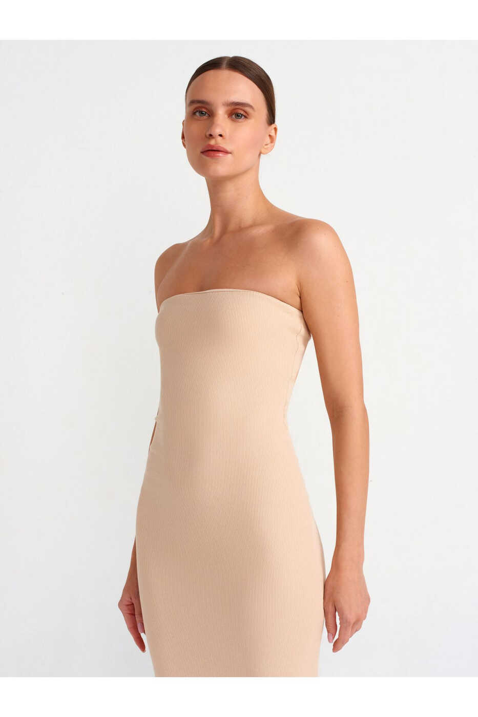 Combining style and comfort, the 91100 Strapless Midi Dress will be an essential part of your wardrobe. The light beige color complements all skin tones, offering a graceful look. The strapless design highlights your shoulders while the midi length provides both a stylish and comfortable fit.