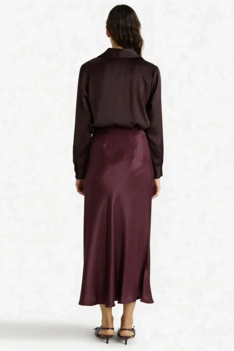 Burgundy Satin Midi Skirt | A-Line Elegant Skirt