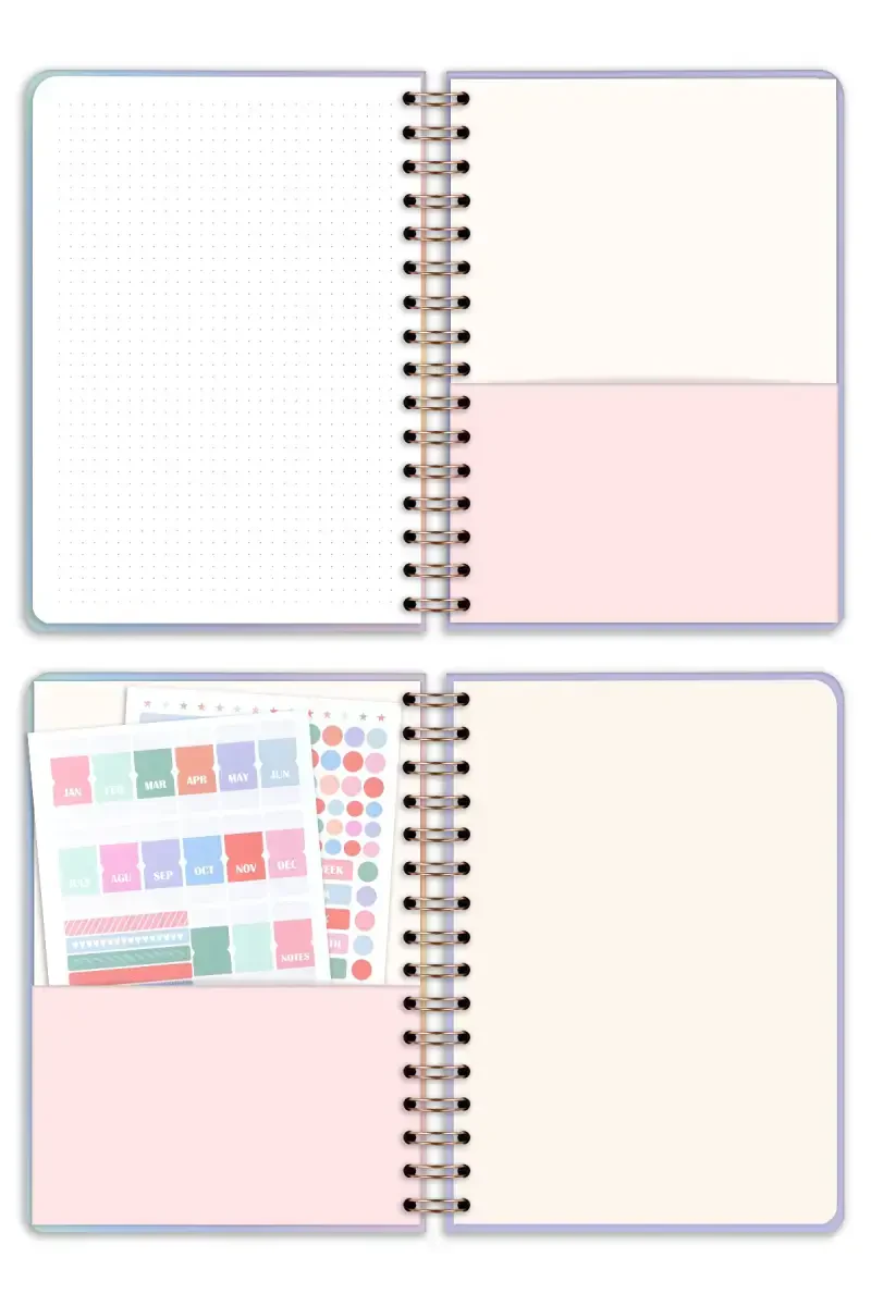 The A5 Spiral Undated Planner Agenda is the ideal tool for those who want to manage time and keep motivation at the highest level. This special design agenda is offered with Matt Notebook quality and has been carefully prepared to make your planning process more enjoyable and efficient. This agenda, which attracts attention with its vibrant and energetic rainbow colors, offers the freedom to start using it at any time of the year with its perpetual structure. Whether you are a student or a professional, it will be much easier to achieve your goals, track your habits and organize your daily tasks with this agenda. The internal structure of the agenda has been designed considering the needs of users. Monthly and weekly planning sections help you to set your goals in detail and track your steps, while specially designed motivation pages will inspire you and keep your energy high. These pages, enriched with inspiring quotes and different content that change every month, will transform your planning process not only into being organized but also into an opportunity for your personal development. The A5 Spiral Undated Planner Agenda is not just a planner but also a source of motivation. Thanks to the special sections inside, you can take notes of the movies you want to watch, the books you want to read, the places you want to visit, and take concrete steps to achieve these goals. The dotted pages inside the agenda are ideal for free planning and creative notes, so you can freely express your thoughts and visualize your projects. Produced using high quality 90 gr. 1st Class paper, this agenda offers a comfortable writing experience by preventing ink smearing. Thanks to its spiral structure, you can easily turn the pages and quickly reach the page you want. In addition, the double-sided pocket on the back of the agenda is designed to safely store your documents, cards and small notes. The A5 Spiral Undated Planner Agenda is not only functional but also an aesthetic product. While its colorful and modern interior design makes your planning process more enjoyable, its stylish and eye-catching exterior design allows you to reflect your style. Two sticker pages offer you an additional opportunity to personalize your agenda and mark important dates. This agenda brings together everything you need to organize your life, achieve your goals and keep your motivation high.