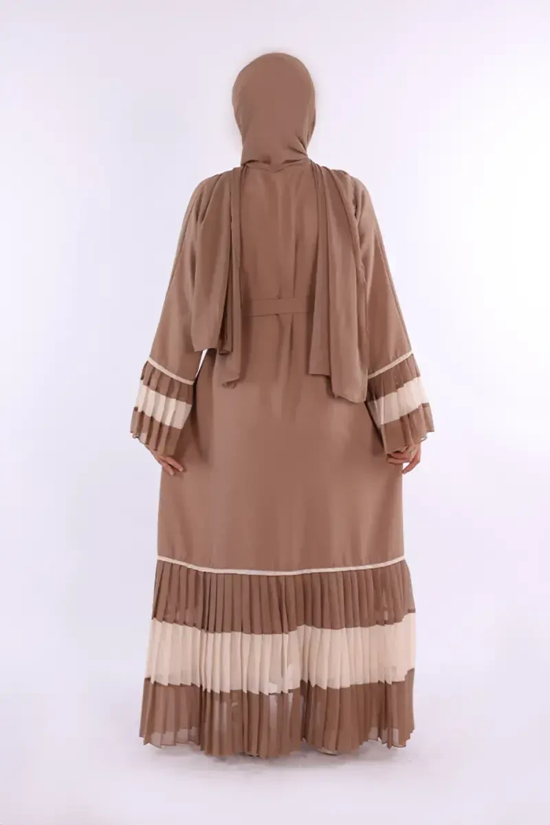 Двухцветная плиссированная абайя с поясом на талии и отделкой рукавов и подола 7454 Vizon, элегантная и стильная, станет идеальным выбором для завершения вашего стиля как для особых случаев, так и для повседневной жизни. Эта абайя, сочетающая в себе благородство цвета визон с его изысканностью, обеспечивает комфорт в носке благодаря качественной структуре ткани.