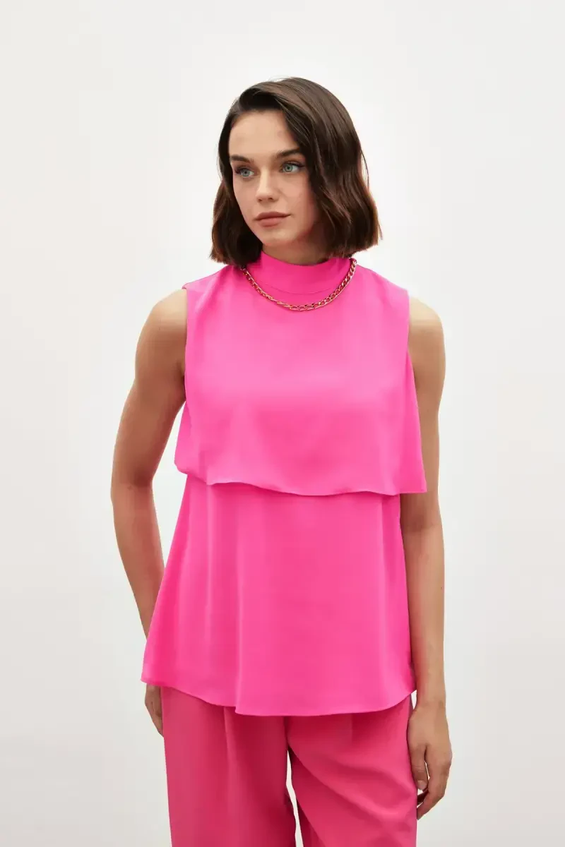 The Accessory Detailed Ruffle Blouse, which combines elegance and comfort, is ready to become the new favorite of your wardrobe. This blouse, which will add energy and vibrancy with its fuchsia color, offers a unique style with its elegant ruffles and eye-catching accessory details.