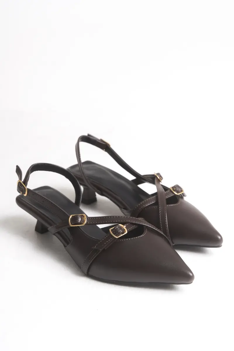 Acı Kahve Cilt Mat Gold Tokalı 3 cm. Kısa Topuklu Kadın Ayakkabı Sivri Burun-Kahve Cilt