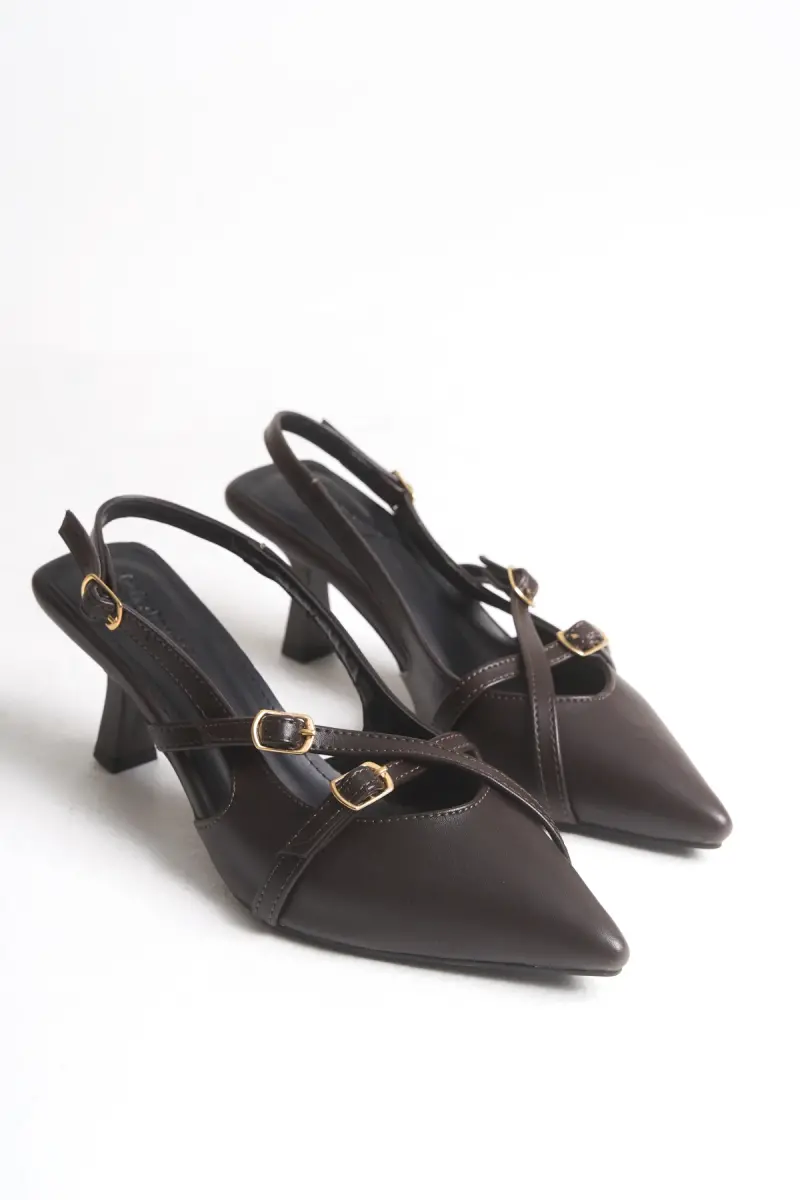 Acı Kahve Cilt Mat Gold Tokalı Topuklu Kadın Ayakkabı Sivri Burun-Kahve Cilt