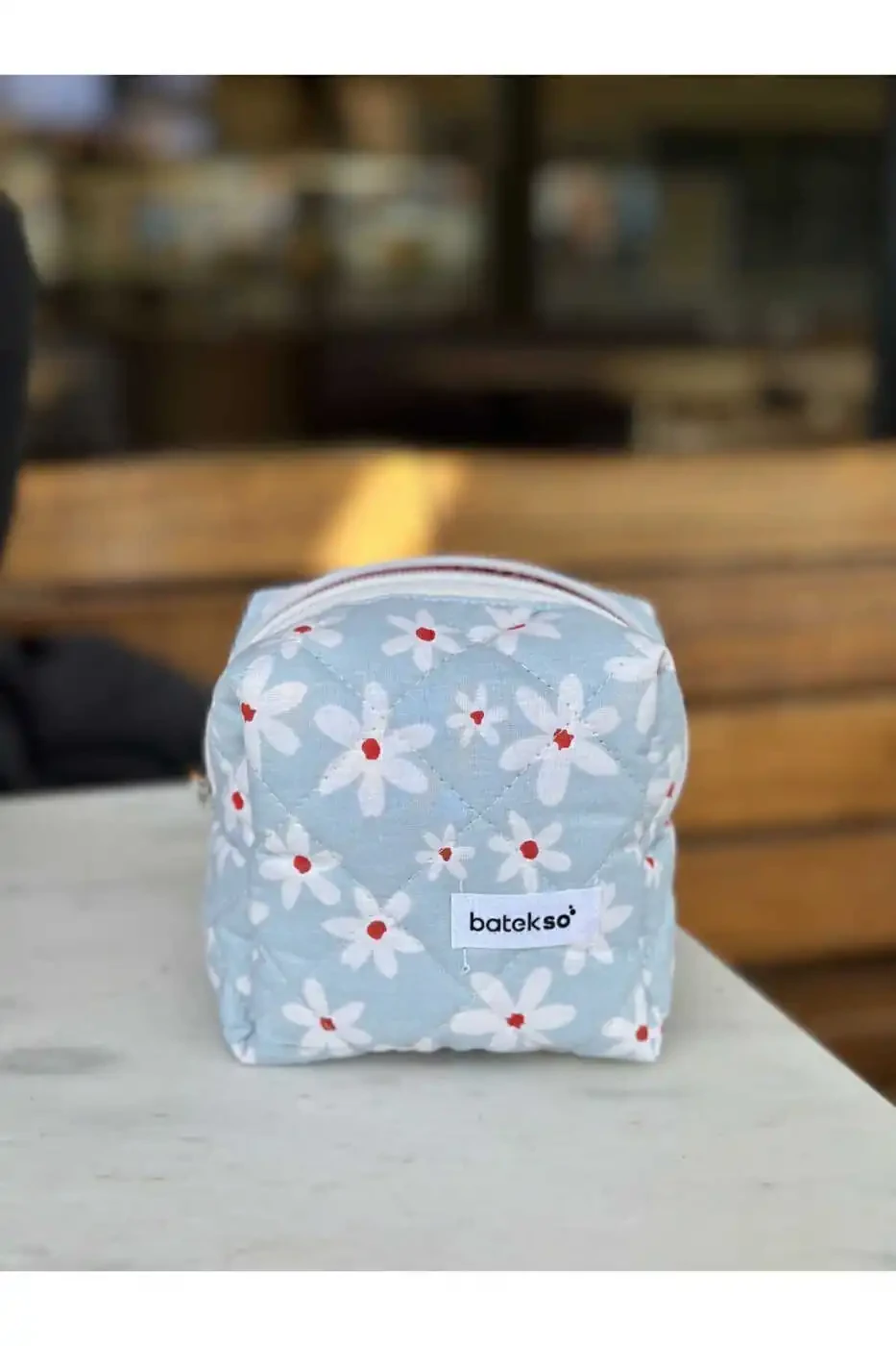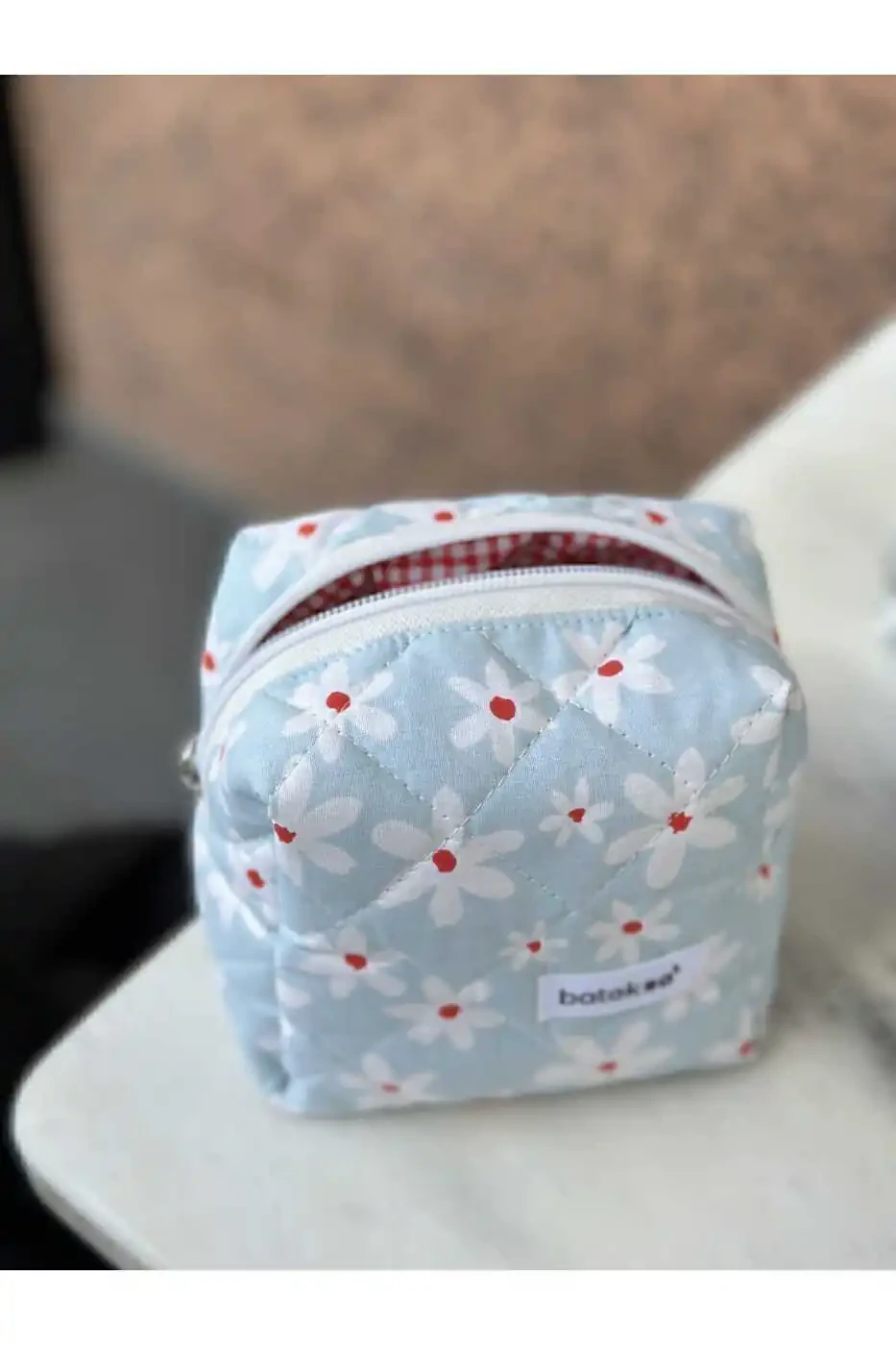 Çantanın dış kısmını süsleyen canlı açık mavi renk ve sevimli papatya deseni, size taze ve enerjik bir görünüm kazandırırken, aynı zamanda eşsiz bir tarz yaratmanıza yardımcı olur. Dayanıklı ve su geçirmez malzemesiyle, makyaj malzemelerinizi, kozmetik ürünlerinizi veya diğer küçük eşyalarınızı güvenle taşıyabilirsiniz.