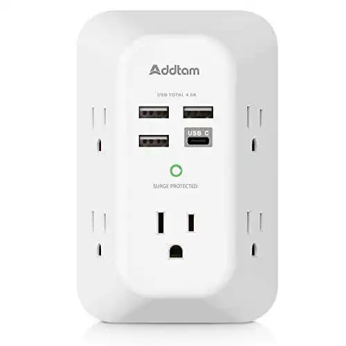 【9 IN 1 Function USB Wall Outlet】- Fit duplex outlet perfectly, just plug in to use. Please NOTE: For some outlets, the white plastic prong can be cut off before using. You get 5 AC outlet splitter (3 sides) with wide space in between; 4 USB charger ports; 1800 joules surge protector protect electronics by improving your power quality 【USB- C Fast & Smart Charge】- 4 USB ports total 4.5 A, each USB A port features 2.4A Max output. USB C charging port features 3A MAX. Built- with smart technology, detecting charging devices and deliver optimal charging speed automatically, compatible with most USB devices. NOTE: The UCB-C port doesn't support any other devices which need 14~22V charging voltage 【1800J Surge Protector Outlet】- 3 complementary Surge Protection Circuits, TVS(transient voltage suppressor) MOV(metal oxide varistor) GDT(gas discharge tube), with response speed less than 1Ns, and minimum energy-absorbing capacity of 1800 Joules, much more quickly and reliably than the traditional MOV surge protector circuit. ("SURGE PROTECTED" indicator light on to show your devices are protected) 【Super Safety】- ETL Certificates. This power strip has overload protection, short-circuit protection, over current protection, over-voltage protection and overheating protection. It will automatically cut power to protect connected devices when voltage surge is overwhelming. Combined with fire-resistant casing- keeping you and your devices completely safe 【Wide Space】- With 3-sided Power Strip design, 5 AC outlets with long space in between, larger than a standard socket- Making it easier to use for all kinds of equipment and without blocking each other