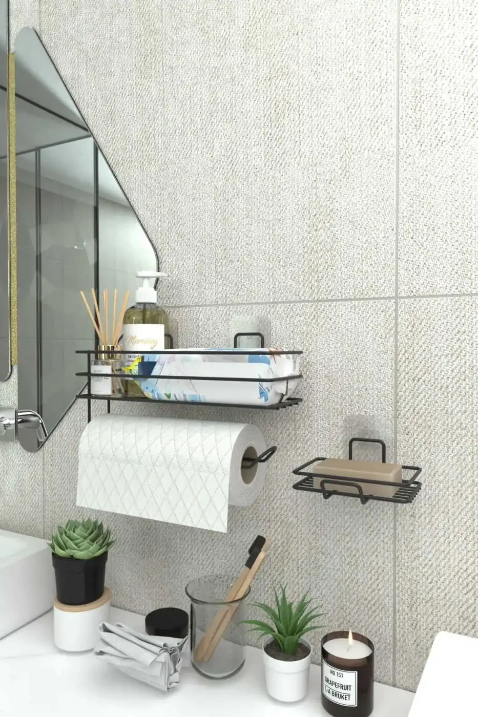 Are you looking for a perfect solution to organize your bathroom and kitchen and create a more spacious area? The Adhesive Bathroom Shelf, Paper Towel Holder, and Metal Soap Dish Set Organizer is just for you! This multifunctional set complements any decoration style with its sleek and modern design. Made of durable and stainless material, this set offers long-lasting use. The wall-mounted paper towel holder can be easily mounted next to your sink or on the wall, keeping your paper towels always at hand. The stylish and modern metal soap dish helps you store your soaps neatly. This set provides the extra storage space you need in your bathroom or kitchen while offering a stylish look.