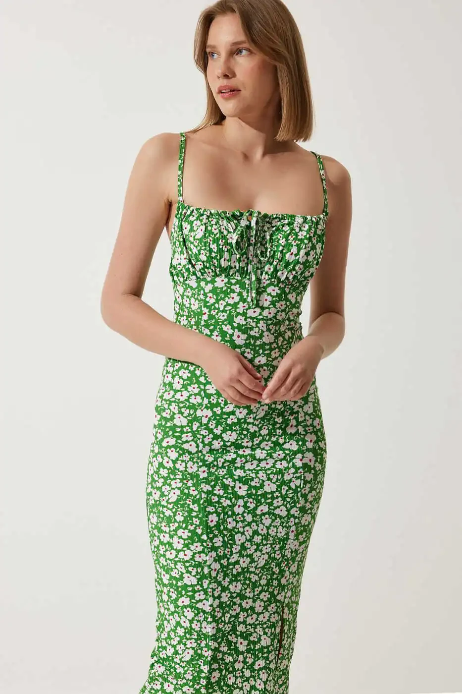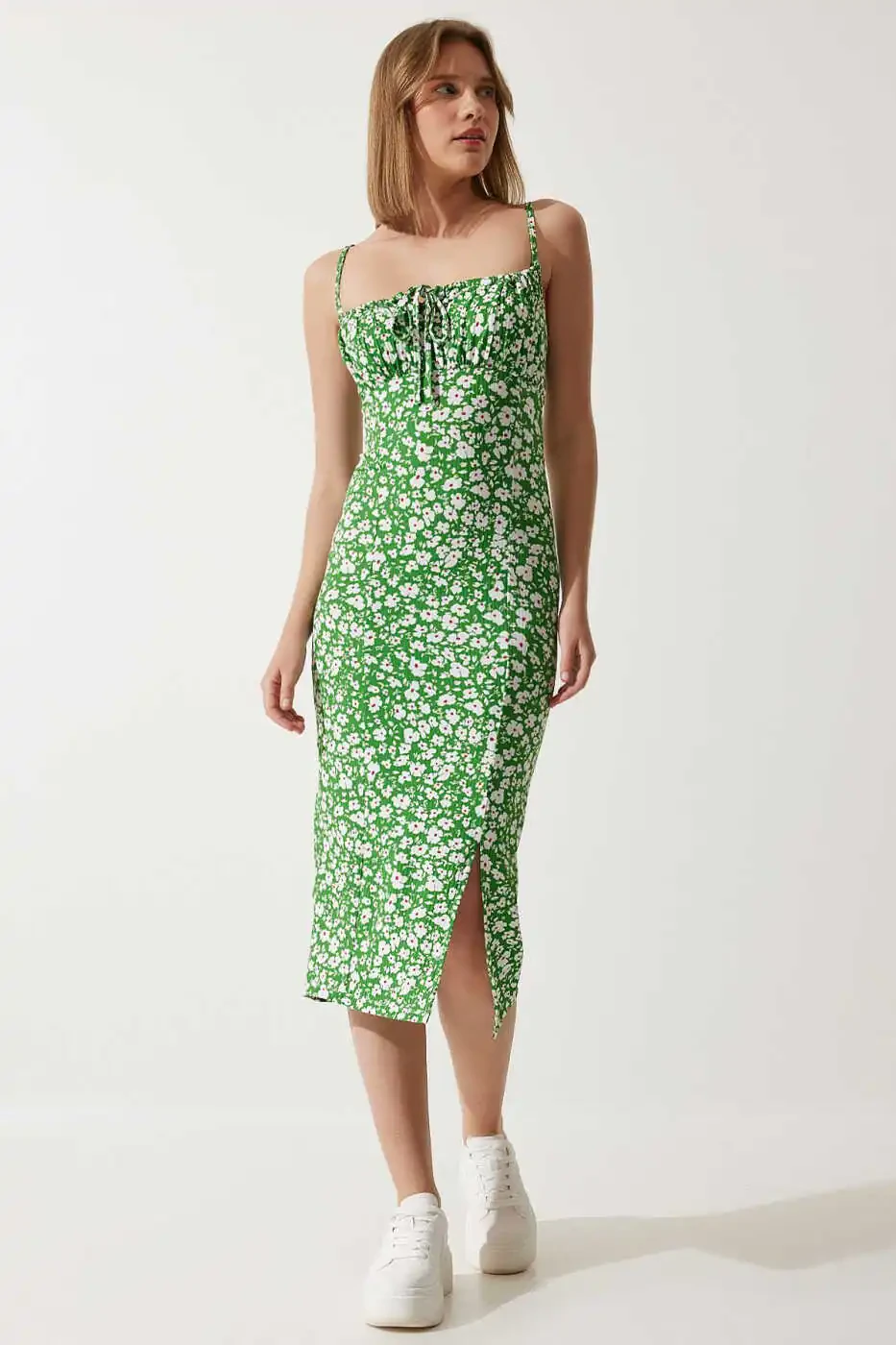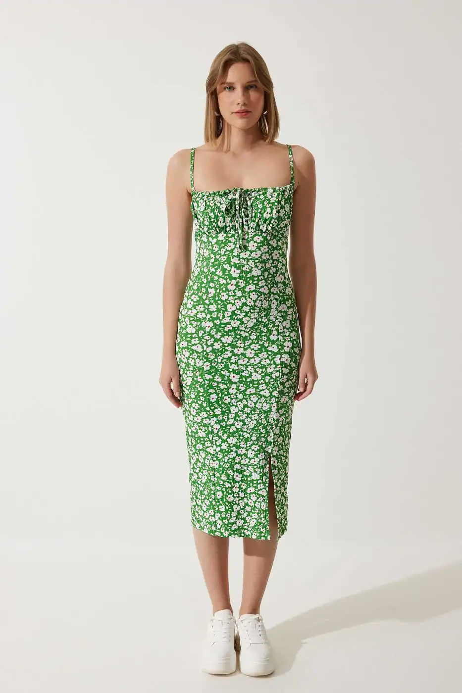 Yashil gulli yozgi triko libos - midi uzunlik - Aksiya narxi