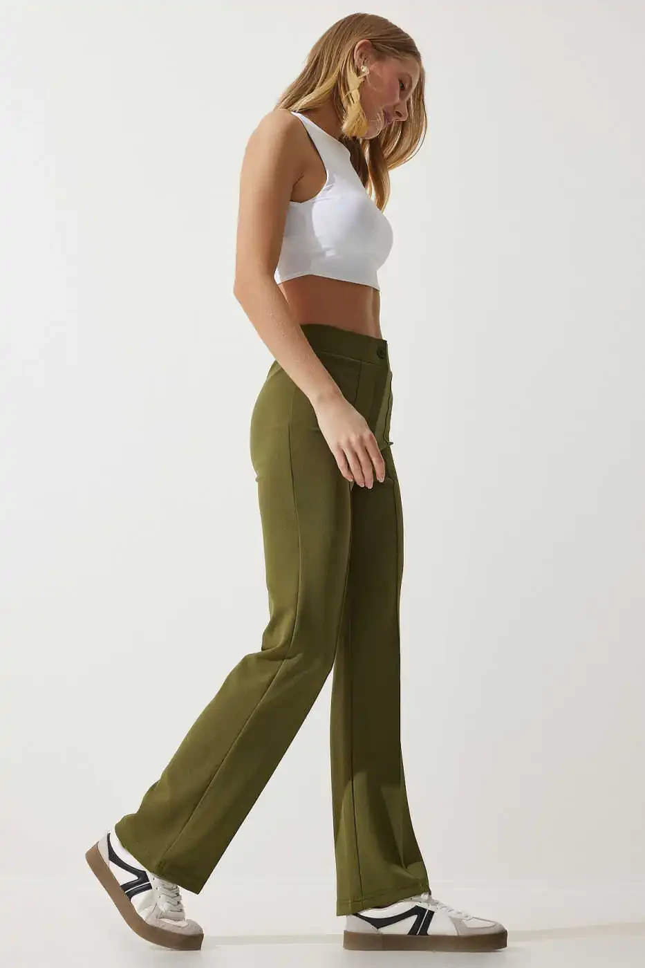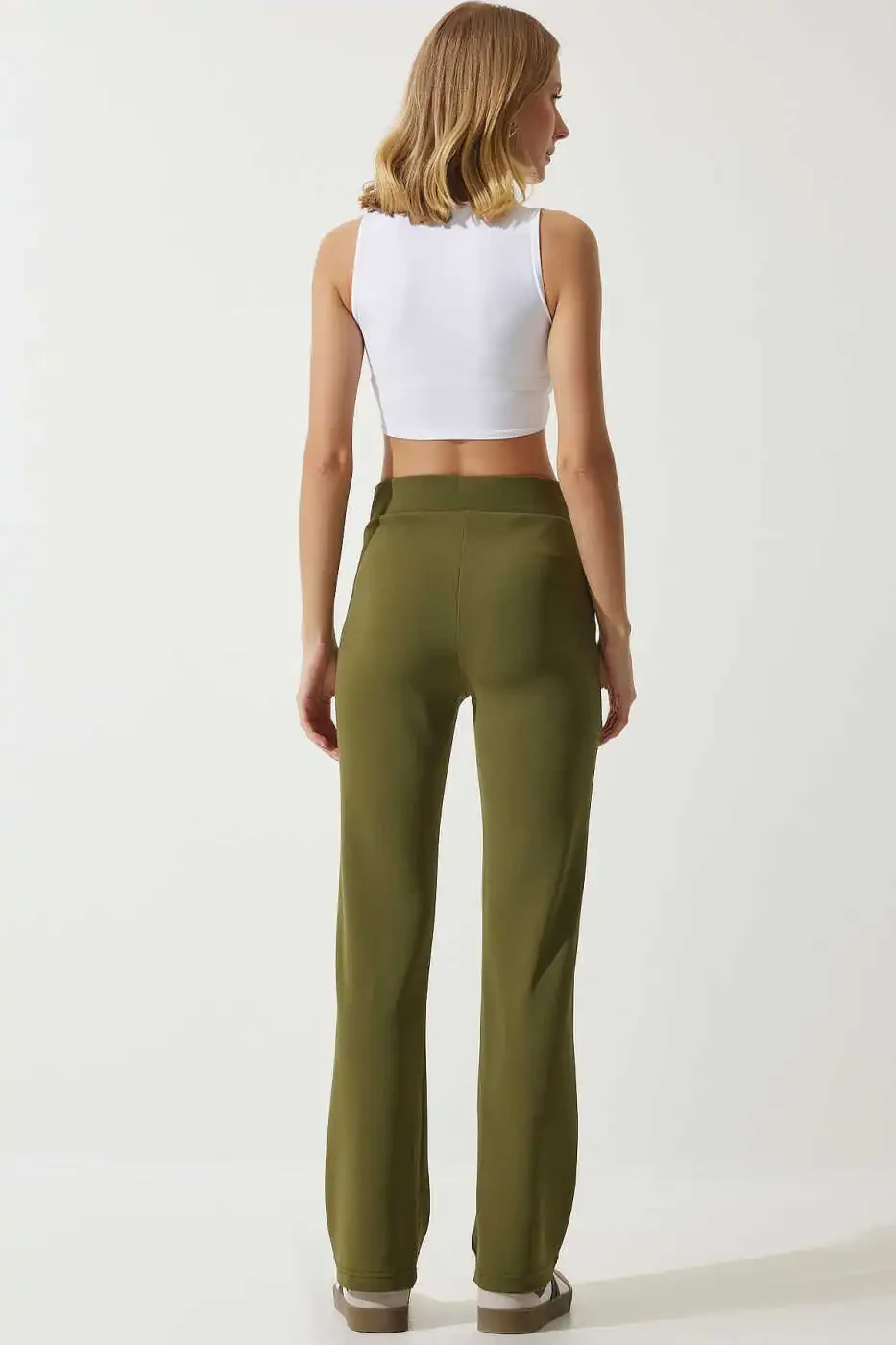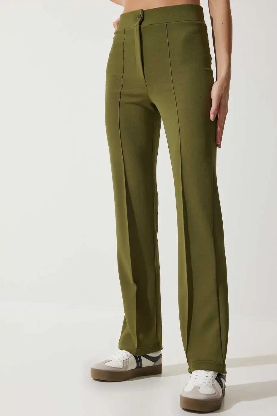 RV00090 моделига эга замонавий ва қулайликни бирлаштирган ҳаки рангли юқори белданлик эластик трикотаж шим билан танишинг! Бу махсус дизайндаги шим 60% полиэстер, 20% пахта ва 20% эластандан иборат юқори сифатли матодан тайёрланган бўлиб, кун бўйи қулайликни кафолатлайди. Юқори бел тузилиши туфайли қорнингизни йиғади ва сизга ингичка ва чиройли кўриниш беради. Ҳаки ранги ва оддий нақши билан замонавий услубни тақдим этадиган шим, тўғри силуэти билан баданингизни нозик қилиб ўраб олади, бироқ ҳеч қачон сиқмайди. Узун кесими оёқларингизни узунроқ ва ингичкароқ кўрсатиб, трубасимон пошна тафсилоти замонавий ва чиройли кўриниш беради. Чанноқ тўқима мато тузилиши туфайли узоқ йиллар давомида завқ билан фойдаланиш мумкин бўлган бу шим ҳар қандай юқори кийим билан ажойиб мос келади. Бизнинг Basic коллекциямизнинг бир қисми бўлган бу қулай трикотаж шимни кундалик ҳаётингизда, иш ҳаётингизда ёки байрам кунларингизда бемалол танлашингиз мумкин бўлган идеал вариант ҳисобланади. Фасллар ўзгаришида ўртача қалинликдаги матоси билан идеал қулайликни тақдим этади ва тугмали тафсилотлари билан функционалликни алоҳида ажратиб кўрсатади. Trendyol кафолати билан сизга етиб борадиган бу маҳсулотни қўлдан бой берманг!