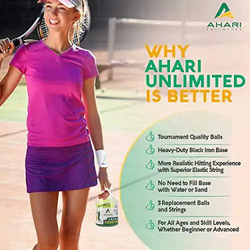 ✅【3 REPLACEMENT BALLS】Our Valuable Tennis Trainer Set includes 3 replacement balls attached to durable elastic strings as the main ball, which makes our tennis training set the best choice for you. Our tournament level balls are made of safe & durable materials, covered with premium felt with 60% wool which is the top level of quality for a tennis ball. Our Trainer comes in a cylinder that can fit into your tennis bag, and the replacement balls are packed in an airtight & sealed canister. ✅【HEAVY-DUTY METAL BASE】Ahari Unlimited Tennis Trainer Set contains a black iron base that is heavy enough to stay stable on the ground even with the hardest forehands, it doesn’t require filling with water & sand each training session to increase the weight like cheap plastic baseboards out there, keeping your hands clean. It also features a non-skid rubber grip at the bottom to increase the friction with the ground and improves stability, which makes it works well on most surfaces. ✅【PERFECT STRINGS ELASTICITY】Our Pro Tennis Rebounder Set contains wear-resistant elastic strings with little less elasticity than other brands for a more realistic hitting experience, which has been well received as tennis gifts by many advanced players (the ball will rebound with convenient speed). Our professional strings attached carefully to our tennis balls and have very high resilience to bear intense tennis training, so you can strike as hard as you can with no fear of strings breaking. ✅【IDEAL FOR SOLO TRAINING】Ahari Unlimited Tennis Practice Rebounder Set comes with everything you need to take your tennis skills to the next level or just for warm-up without the need of a net or a partner when the ball is knocked away, it will always come back, so that it can be hit again afterward. Tennis accessories like ours is an ideal tennis set for practicing tennis anytime and anywhere whether indoor & outdoor, and it is perfect for adults and kids whether a beginner or a professional. ✅【100% SATISFACTION GUARANTEED】Order Our Tennis Training Equipment now with Risk-Free, we assure you that you will love the quality and durability of our self-tennis trainer, (You will be Amazed). If you aren't in love with our tennis practice trainer contact us & we will do our best to make you more than happy. THE PERFECT TENNIS GIFT! SO, DON'T WASTE MORE OF YOUR VALUABLE TIME AND TAKE THE RIGHT DECISION AND ORDER OUR PREMIUM TENNIS TRAINER & YOU WON'T REGRET IT!