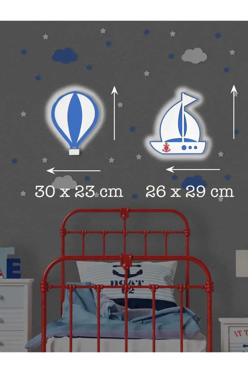 Çocuklarınızın hayal dünyasını renklendirecek, odalarına sıcak ve sevimli bir dokunuş katacak Ahşap Balon ve Gemi Figürlü Bebek ve Çocuk Odası Dekoratif Ledli Aydınlatma/Gece Lambası 2'li Set ile tanışın! UniQraft Design kalitesiyle üretilen bu özel set, miniklerin odasını masalsı bir atmosfere dönüştürmek için tasarlandı. Set içeriğinde bulunan birbirinden şirin figürler ve aksesuarlar sayesinde, çocuğunuzun odasını kişiselleştirirken aynı zamanda keyifli bir ambiyans yaratabilirsiniz.Setimiz, 1 adet balon aydınlatma (30x23cm), 1 adet gemi aydınlatma (26x29cm), 30 adet ahşap yıldız (2,5cm) ve 4 adet ahşap bulut (13x7,5cm) içermektedir. Balon ve gemi figürlü aydınlatmalar, odanıza sıcak bir ışık yayarken, ahşap yıldızlar ve bulutlar ise duvarlarınıza sevimli bir dokunuş katacak. Ahşap yıldızlar ve bulutlar, çift taraflı bant ile kolayca monte edilebilirken, aydınlatmaların arkasındaki askı aparatı sayesinde çivi veya vida yardımıyla duvara asabilirsiniz. Montajı son derece kolay olan bu set, kısa sürede çocuğunuzun odasına bambaşka bir hava katacaktır.Aydınlatmalar, beyaz led ışıklı olarak kullanıma hazır şekilde gönderilmektedir. Üzerindeki buton sayesinde ışıkları kolayca açıp kapatabilirsiniz. 6mm kalınlığındaki aydınlatmalar ve 3mm kalınlığındaki ahşap yıldızlar ve bulutlar, dayanıklı ve uzun ömürlüdür. Ledli aydınlatmaların her biri 1 adet 9V pil ile çalışmaktadır. Pil ürüne dahil değildir, ancak sayfamızdan ayrıca satın alabilirsiniz. Ürünün temizliği de oldukça kolaydır. Hafif nemli bir bezle nazikçe silerek ürününüzü temizleyebilirsiniz.Uniqraft Design imzası taşıyan bu özel set, çocuklarınızın odasına sadece bir aydınlatma değil, aynı zamanda bir oyun alanı ve hayal dünyası sunar. Onların güvenliği ve sağlığı ön planda tutularak üretilen bu ürün, CE sertifikalıdır ve zararlı madde içermez. Sevdiklerinize özel günlerde hediye edebileceğiniz bu anlamlı set, onların yüzünde unutulmaz bir tebessüm bırakacaktır. Şimdi sipariş verin ve çocuğunuzun odasını bu eşsiz set ile aydınlatın!