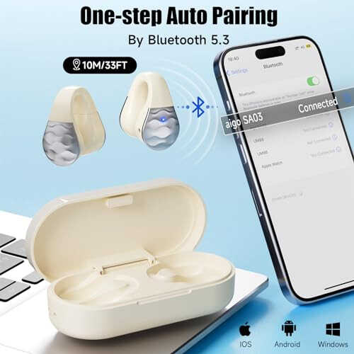Aigo Wireless Earphones Bluetooth Earbuds, Open Ear Clip Headphones for iPhone/Android/Computer, Sport Ear Buds Built-in Mic, Noise Canceling, Waterproof, Wireless Charging, Off White Headset