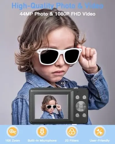 AiTechny Çocuklar İçin Dijital Kamera, genç fotoğrafçılar için mükemmel bir başlangıç noktasıdır. 1080P Full HD video kaydı ve 44MP çözünürlüğe sahip fotoğraflar çekme özelliğiyle, çocuklarınızın anıları yüksek kalitede yakalamalarını sağlar. 32GB SD kartıyla, bolca fotoğraf ve video kaydedebilirler.