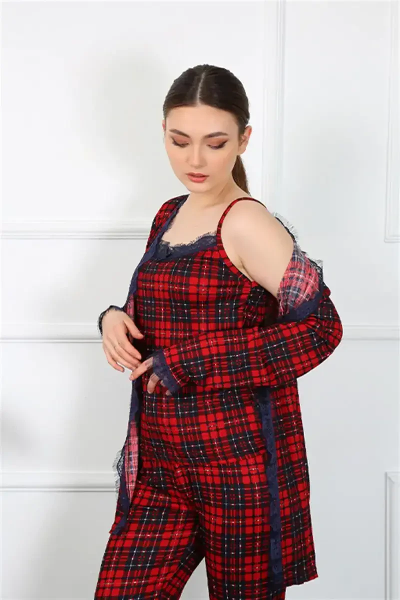 Akbeniz Kadın 3'lü Ekoseli Sabahlık Takımı 16106, evde geçirdiğiniz her anı özel kılmak için tasarlandı. Sabahın ilk ışıklarından gece yatana kadar üzerinizden çıkarmak istemeyeceğiniz bu şık ve rahat takım, üç parçadan oluşuyor: zarif bir sabahlık, konforlu bir pijama takımı ve serinletici bir şort. Ekose deseni, tasarıma klasik bir dokunuş katarken, modern kesimi ile de günümüz trendlerini yakalıyor. Sabahlığın yumuşak dokusu teninizi okşayacak, pijama takımının rahatlığı ise sizi adeta bulutların üzerinde hissettirecek. Şort, özellikle yaz aylarında veya sıcak havalarda mükemmel bir alternatif sunarak gün boyu serin kalmanızı sağlıyor.Akbeniz, bu takımda sadece şıklığı değil, aynı zamanda kaliteyi ve dayanıklılığı da ön planda tuttu. Yüksek kaliteli kumaş seçimi sayesinde, takım uzun yıllar boyunca ilk günkü görünümünü koruyacak ve size eşlik edecek. Sabahlığın belindeki zarif kuşak detayı, vücut hatlarınızı güzel bir şekilde vurgularken, pijama takımının esnek beli gün boyu rahat bir kullanım sunar. İster kahvaltınızı hazırlarken, ister kitap okurken, ister televizyon izlerken, bu takım size her zaman eşlik edecek.Bu özel tasarım, sadece kendiniz için değil, sevdikleriniz için de harika bir hediye seçeneği olabilir. Doğum günü, yıl dönümü veya sadece "seni düşünüyorum" demek için mükemmel bir armağan. Akbeniz Kadın 3'lü Ekoseli Sabahlık Takımı ile ev giyiminde yeni bir sayfa açın ve konforun keyfini çıkarın. Evde geçirdiğiniz zamanın kalitesini artıracak, şıklığınızı tamamlayacak ve size her zaman iyi hissettirecek bu takımı kaçırmayın.