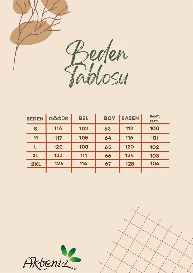 Akbeniz ayollarining bej rangli leopard naqshli paxta qalin pijamalar to'plami bilan uy kiyimida yangi sahifa oching. Qulaylik va nafosatni birlashtirgan ushbu maxsus dizayn kun bo'yi qulaylikni ta'minlaydi, leopard naqshlari esa sizning uslubingizni ta'kidlaydi. Xoh uyda dam olayotganingizda, xoh mehmonlarni qabul qilayotganingizda, har doim o'zingizni nafis va qulay his qilasiz. Yuqori sifatli paxta matosi tufayli teringiz nafas oladi va kun bo'yi terlash muammosini yo'q qiladi. Katta o'lchamdagi kesim harakatlanish erkinligingizni cheklamagan holda qulay foydalanishni ta'minlaydi. Keng oyoqli pastki qismi bilan siz zamonaviy ko'rinishga ega bo'lasiz, yuqori qism bilan mos keladigan naqsh esa yaxlitlikni saqlaydi. Ushbu pijamalar to'plami nafaqat kiyim, balki o'zingizni yaxshi his qilishingizga yordam beradigan turmush tarzidir. Ertalab kofe ichayotganda, kitob o'qiyotganda yoki film tomosha qilayotganda har bir lahzadan zavqlanishga yordam beradi. Akbeniz sifati bilan ishlab chiqarilgan ushbu pijamalar to'plami uzoq umr ko'rish uchun maxsus ishlab chiqilgan. Yuvishdan keyin qisqarish yoki so'nish kabi muammolarga duch kelmaysiz. Bej leopard naqshlari har qanday uslubga mos keladigan abadiy variantdir. Shkafingizning ajralmas qismiga aylanadigan ushbu pijamalar to'plami o'zingiz uchun ham, yaqinlaringiz uchun ham ajoyib sovg'a bo'lishi mumkin. Mahsulotning matosi nozik teri uchun ham mos keladi va allergiya keltirib chiqarmaydi. Agar siz kunning charchog'idan xalos bo'lishda qulaylikdan voz kechmoqchi bo'lmasangiz, Akbeniz ayollarining bej rangli leopard naqshli paxta qalin pijamalar to'plami siz uchun. Uyda o'tkazadigan vaqtingizni yanada yoqimli va qulay qiling. Esda tuting, qulaylik shunchaki tanlov emas, balki turmush tarzi hamdir. Ushbu pijamalar to'plami bilan o'zingizni erkalang va uyda bo'lishdan zavqlaning. Leopard naqshlari bilan energiyangizni oshiring va har bir lahzadan zavqlaning. Akbeniz har doim qulaylik va nafosatni birlashtirgan dizaynlari bilan siz bilan.