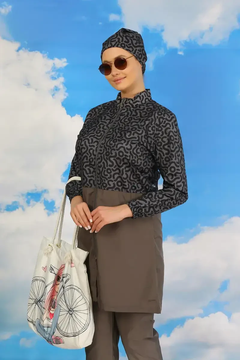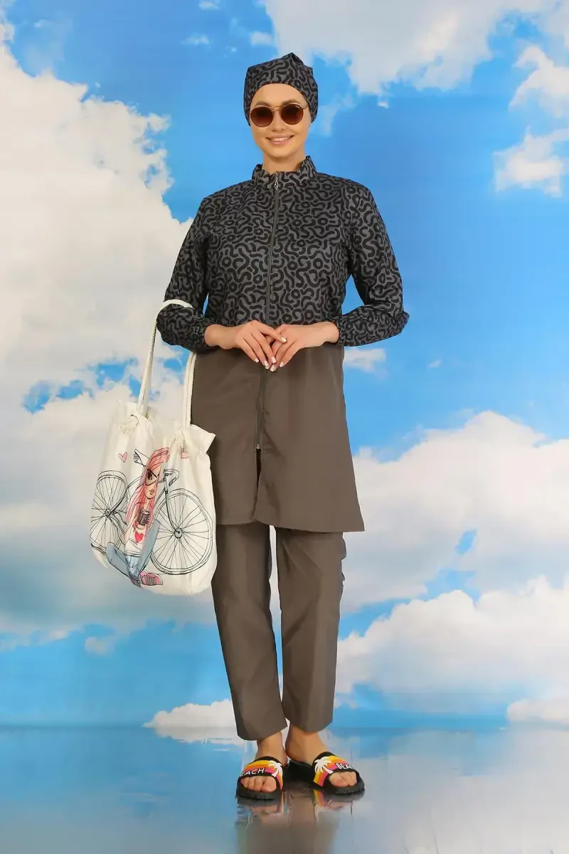 Akbeniz Füme Desenli To'liq Tesettür Mayo | Shimli, UV Himoyali, Tez Quriydigan Mato