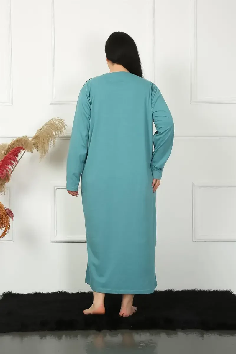 Experience the perfect blend of comfort and elegance with the Akbeniz Big Long Sleeve Lace Petrol Maternity Nightgown 1355. Specifically designed for plus-size expectant and new mothers, this nightgown prioritizes comfort while dazzling with its elegant details. The sophistication of the petrol color combines with lace details to add a sophisticated touch to the nightgown. The nightgown's long-sleeved design offers a warm and comfortable sleep experience even in cool weather. Thanks to its 100% cotton fabric, it allows your skin to breathe, prevents sweating, and provides lasting comfort throughout the day. Produced with Akbeniz quality, this nightgown is ideal for long-lasting use. The loose-fitting cut of the product does not restrict your freedom of movement and gently wraps your body. It is specially designed to meet the increased comfort needs during pregnancy and breastfeeding. The delicate lace details at the hem of the nightgown add elegance to your style, while the petrol color is always a fashionable option. This nightgown will be an indispensable part of your wardrobe, allowing you to feel special and beautiful while relieving the tiredness of the day. Akbeniz Big Long Sleeve Lace Petrol Maternity Nightgown 1355 is not just a nightgown, but also a favor you will do to yourself. If you don't want to compromise on elegance while increasing your sleep quality, this nightgown is for you. This product, which contains care and quality in every detail, is designed for the comfort and elegance of mothers. You can safely purchase the product and take advantage of our fast shipping. The size on the mannequin is 3XL, which shows the fit of the product in the plus size range. You can find a perfect fit by choosing the one that suits you from the size chart. Enjoy comfortable and stylish sleep with Akbeniz.