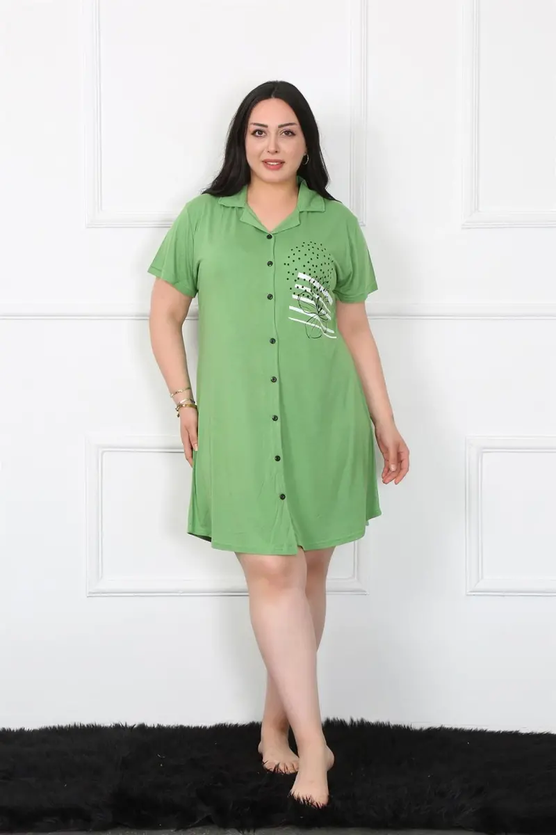 Акбениз Большой Размер Трикотажный Зеленый Туника-Ночная рубашка на пуговицах 1025