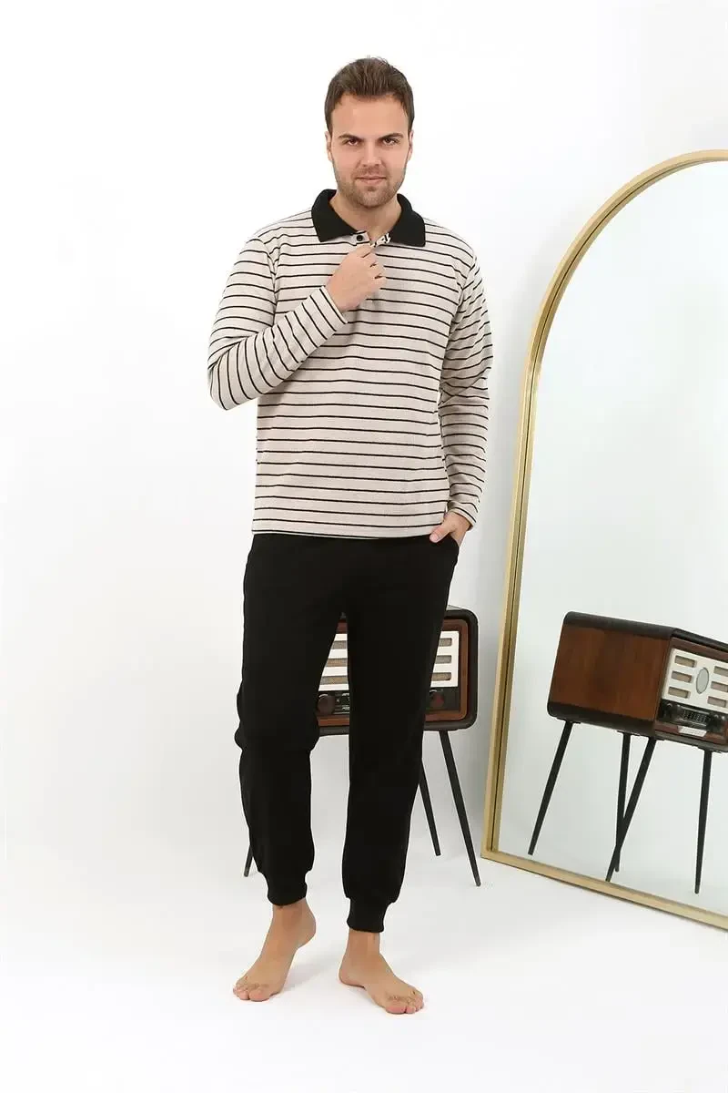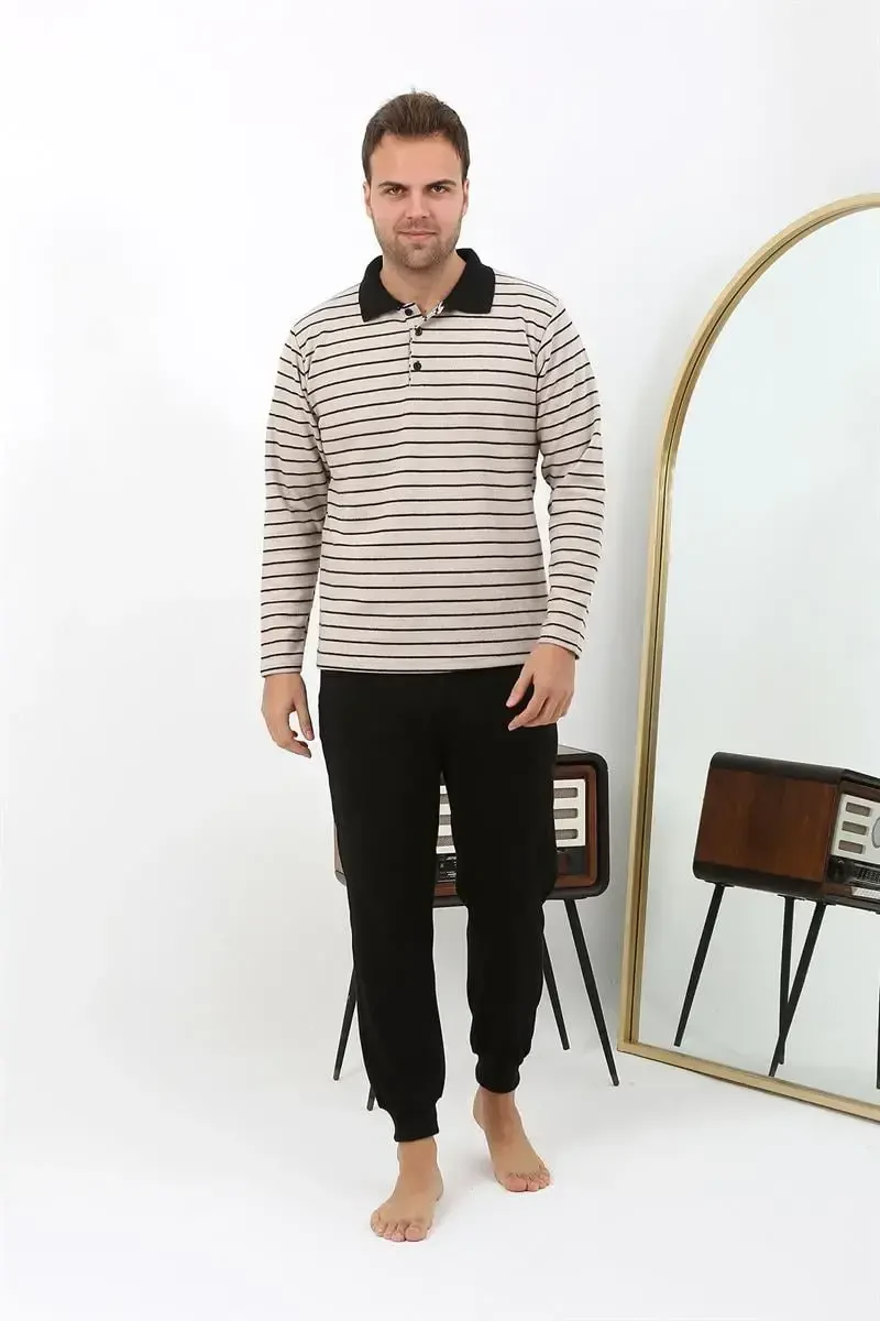 Erkak pijamalar to'plami, polo yoqali pijama, uzun yengli pijama, paxtalik pijama, krem pijama, qulay pijama, uy kiyimi, Akbeniz pijama, erkaklar kiyimi, pijama to'plami
