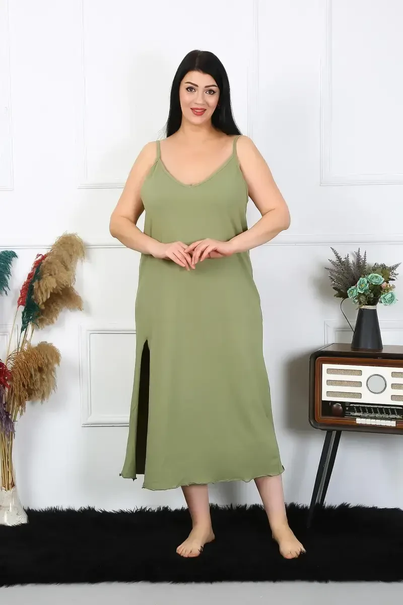 Büyük Beden Haki Gecelik | İp Askılı Pamuklu Uzun Gecelik 2XL-6XL