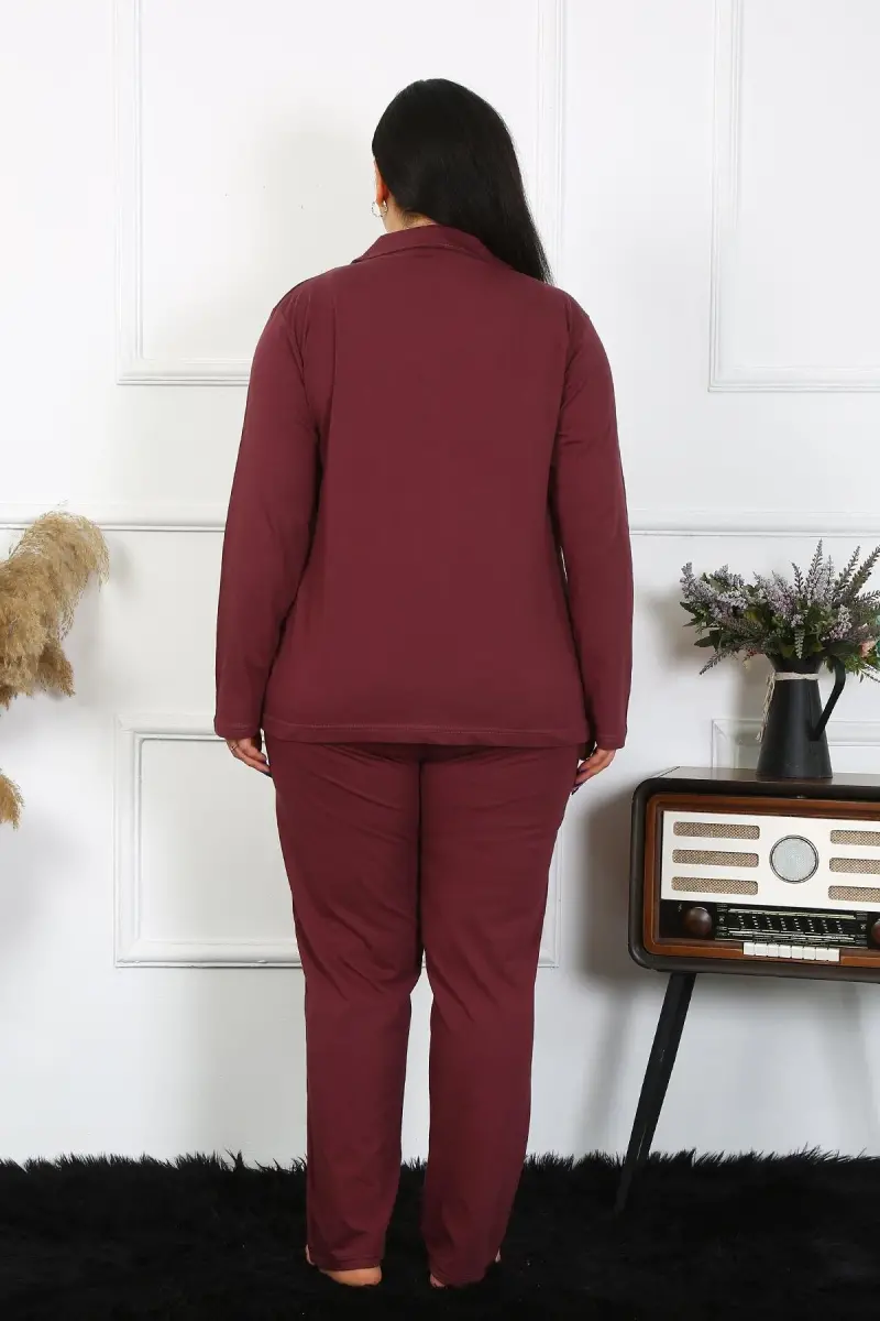 Akbeniz Kadın Büyük Beden Pamuklu Cepli Düğmeli Mürdüm Pijama Takım 202401