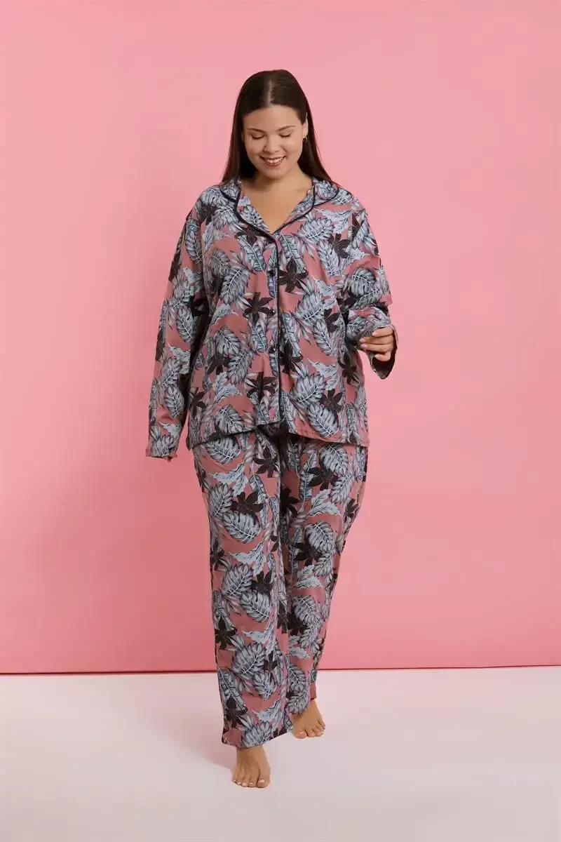 Büyük Beden Somon Yaprak Desenli Pamuklu Pijama Takımı | Akbeniz