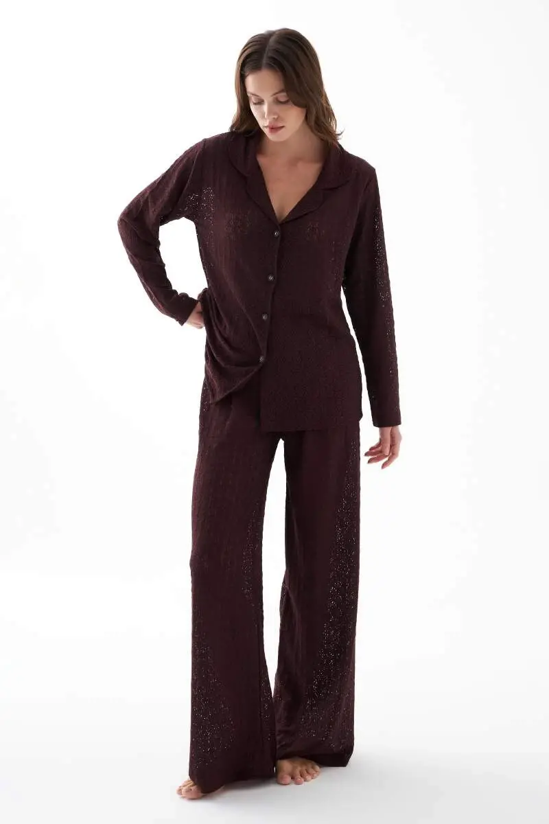 Akbeniz Kadın Mürdüm Önden Düğmeli Rahat Kesim Pijama Takımı ile günün yorgunluğunu üzerinizden atarken, şıklığınızdan da ödün vermeyin. Hayatın yoğun temposundan sıyrılıp kendinize ayırdığınız o değerli anlarda, konforunuzu ve stilinizi bir arada sunan bu özel tasarım, ev giyiminde yeni bir soluk getiriyor. Mürdümün asil ve büyüleyici tonu, teninizle mükemmel bir uyum yakalayarak, size sofistike bir hava katacak.Bu pijama takımı, sadece bir giysi değil, aynı zamanda kendinize yapacağınız bir iyiliktir. Yumuşak dokusu, teninize nazikçe dokunarak rahat bir uyku deneyimi sunar. Dantel hissi veren özel ajurlu kumaşı, pijamaya zarif bir dokunuş katarken, şıklığınızı da ön plana çıkarır. Önden düğmeli tasarımı, kullanım kolaylığı sağlarken, rahat kesimi sayesinde gün boyu hareket özgürlüğünüzü kısıtlamaz.Akbeniz Kadın Mürdüm Önden Düğmeli Rahat Kesim Pijama Takımı, sadece uyurken değil, evde geçirdiğiniz tüm anlarda size eşlik edecek. Sabah kahvaltınızı hazırlarken, kitap okurken, film izlerken veya sevdiklerinizle sohbet ederken, her zaman rahat ve şık hissedeceksiniz. Bu pijama takımı, evde geçirdiğiniz zamanı daha keyifli ve özel kılmak için tasarlandı.Gardırobunuzun vazgeçilmez bir parçası olacak bu pijama takımı, zamansız tasarımı ve yüksek kaliteli malzemesi sayesinde uzun yıllar boyunca size eşlik edecek. Mürdüm renginin sakinleştirici etkisiyle, günün stresinden arınarak huzurlu bir uykuya dalacaksınız. Akbeniz Kadın Mürdüm Önden Düğmeli Rahat Kesim Pijama Takımı ile evde geçirdiğiniz her anı bir keyfe dönüştürün. Kendinizi şımartmanın ve rahatlığın tadını çıkarın. Bu pijama takımı, sadece bir giysi değil, aynı zamanda bir yaşam tarzıdır. Kendinize değer verin ve Akbeniz kalitesiyle tanışın.