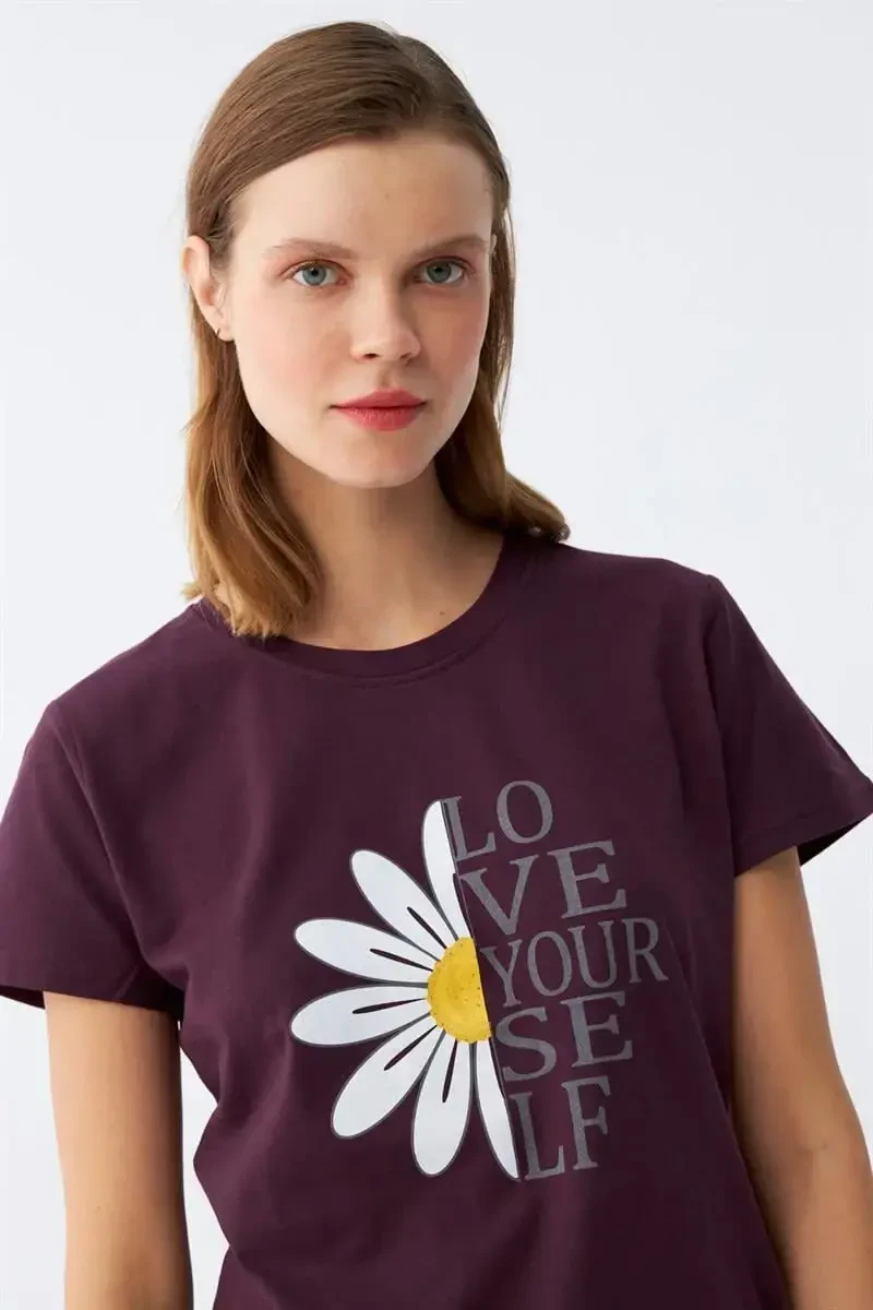 Akbeniz Kadın Mürdüm Papatya Baskılı Kısa Kollu Penye Pijama Takımı
