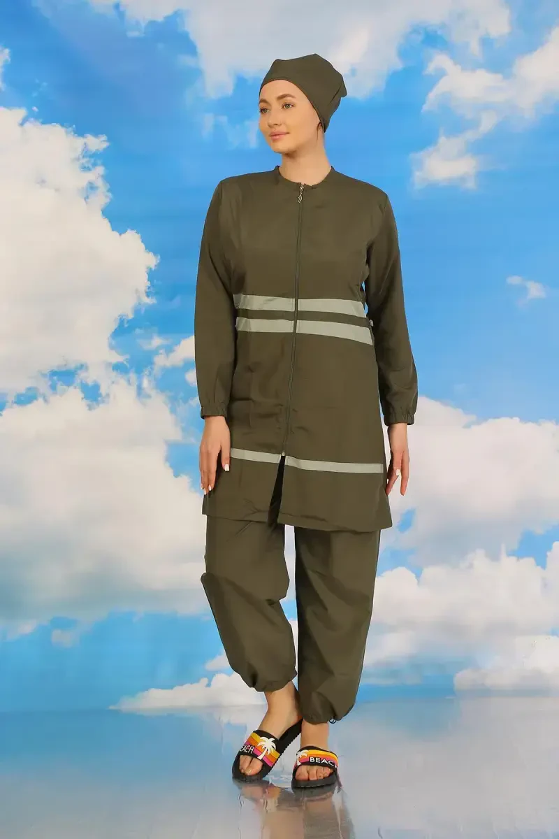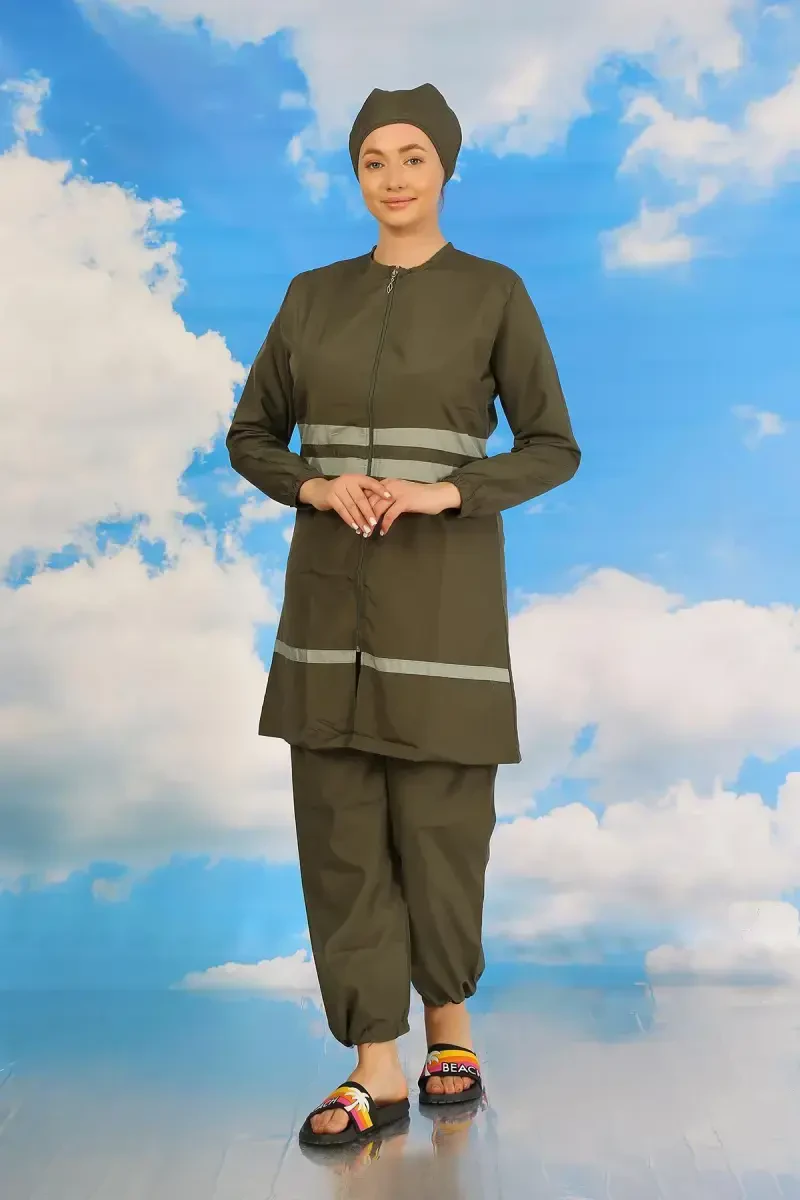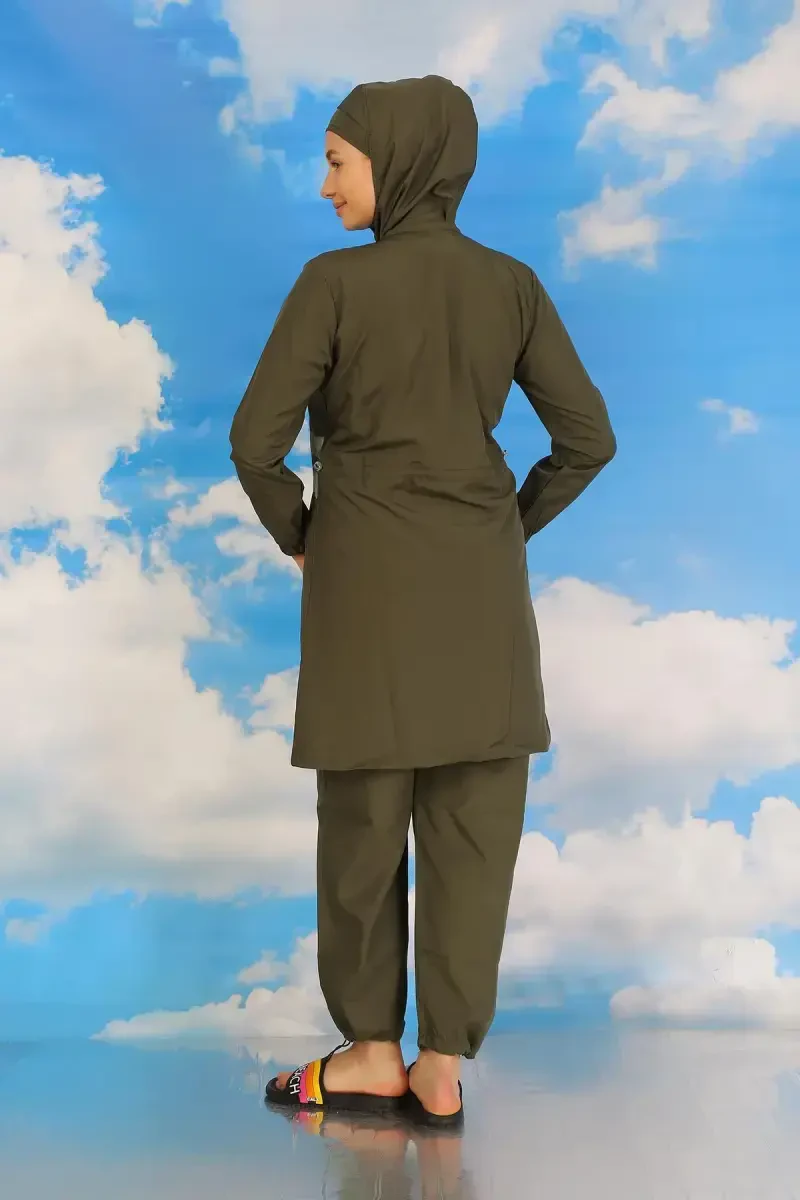 Akbeniz Kadın Tam Tesettür Mayo Haki 31061 ile yazın tadını çıkarırken şıklığınızdan ve rahatınızdan ödün vermeyin. Bu özel tasarım mayo, tesettür giyim prensiplerine uygun olarak tasarlanmış olup, hem havuzda hem de denizde özgürce hareket etmenizi sağlar. Yüksek kaliteli %100 polyester kumaşı sayesinde hızlı kuruma özelliği sunarken, suyun içinde hafif ve konforlu bir deneyim yaşatır. Haki rengi, doğal ve zarif bir görünüm sunarak, yaz gardırobunuzun vazgeçilmez bir parçası olmaya aday.Akbeniz Tam Tesettür Mayo, sadece şık bir tasarım sunmakla kalmaz, aynı zamanda fonksiyonel detaylarıyla da dikkat çeker. Belinde ve ayak paçalarında bulunan ayarlanabilir lastik klipsleri, mayonun vücudunuza tam oturmasını sağlayarak, hareket özgürlüğünüzü kısıtlamadan güvenli bir kullanım sunar. Bu sayede, suyun içinde rahatça yüzebilir, güneşin ve denizin keyfini doyasıya çıkarabilirsiniz.Mayonun kumaşı, güneş ışığına ve klora karşı dayanıklı olacak şekilde özel olarak işlenmiştir. Ancak, mayonuzun ömrünü uzatmak ve ilk günkü canlılığını korumak için her kullanımdan sonra bol su ile iyice durulamanız önemlidir. Ayrıca, mayonuzu tırtıklı ve pürüzlü yüzeylerle temasından kaçınarak kumaşın zarar görmesini engelleyebilirsiniz. Flouresan renkli mayolarda güneş ışığına bağlı solma görülebilir, bu durum kumaşın doğal bir özelliğidir ve ürünün kalitesini etkilemez.Akbeniz Kadın Tam Tesettür Mayo Haki 31061, toplamda 4 parçadan oluşmaktadır: 1 adet alt pantolon, 1 adet üst tunik ve 2 adet bone. Bu sayede, tam bir tesettür mayo deneyimi sunar ve ihtiyacınız olan her şeyi bir arada bulmanızı sağlar. Manken üzerindeki beden M olup, farklı beden seçenekleri mevcuttur. Beden tablosunu inceleyerek size en uygun bedeni kolayca belirleyebilirsiniz.Bu mayo, sadece bir giyim eşyası değil, aynı zamanda bir yaşam tarzıdır. Akbeniz kalitesiyle üretilen bu mayo ile hem şık görünecek hem de kendinizi rahat ve güvende hissedeceksiniz. Yaz tatilinizde veya günlük kullanımda, bu mayo ile özgürlüğün ve konforun tadını çıkarın.