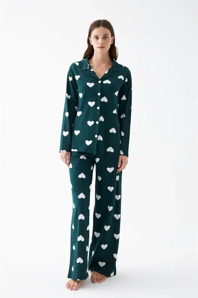 pijama takımı, kadın pijama, zümrüt yeşili, kalp desenli, pamuklu pijama, düğmeli pijama, rahat pijama, ev giyim, Akbeniz, hediye pijama