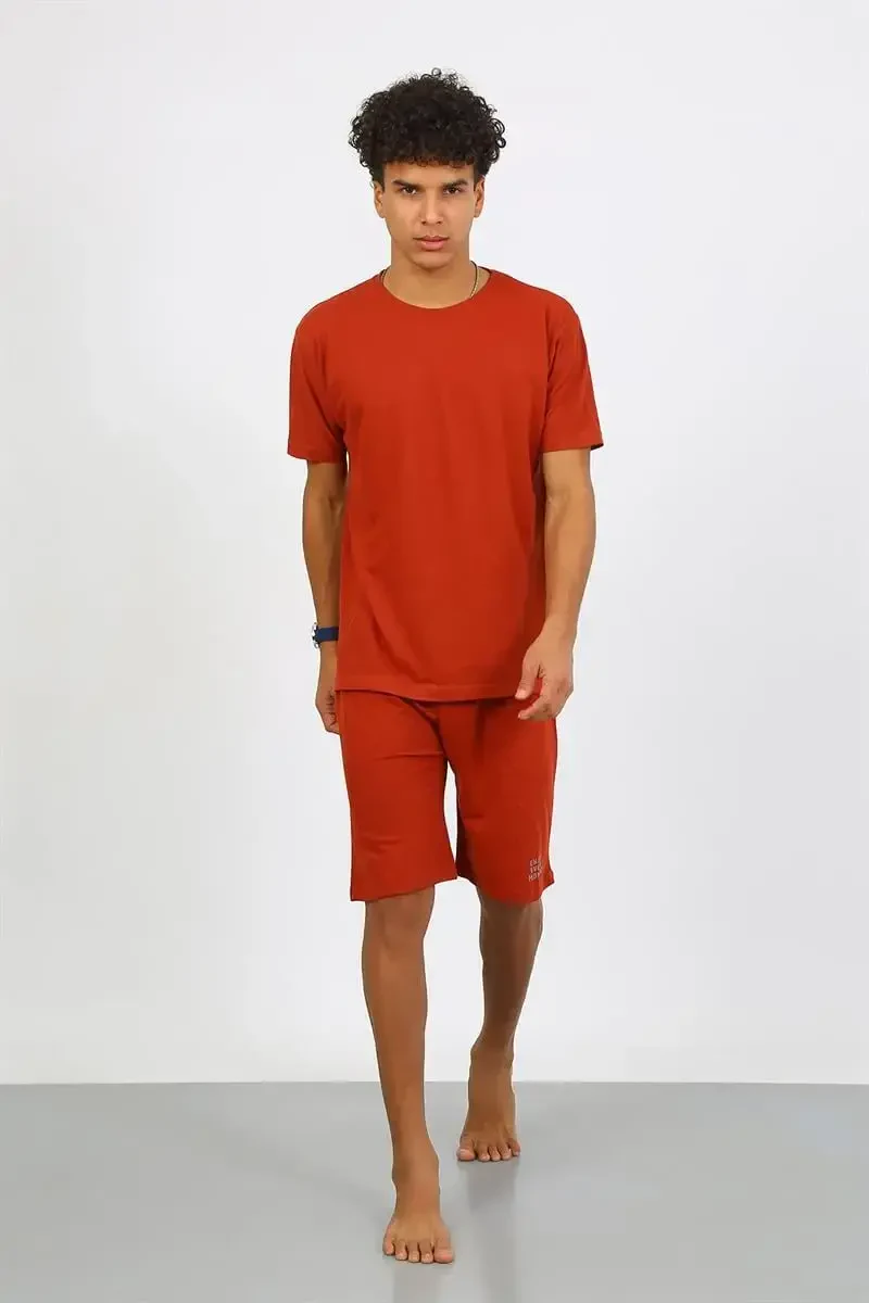 Akbeniz Men's Pajamas Set Terracotta: Cotton, Lacoste Detailed Capri Model - Comfortable and Stylish Loungewear