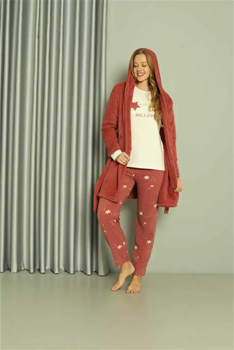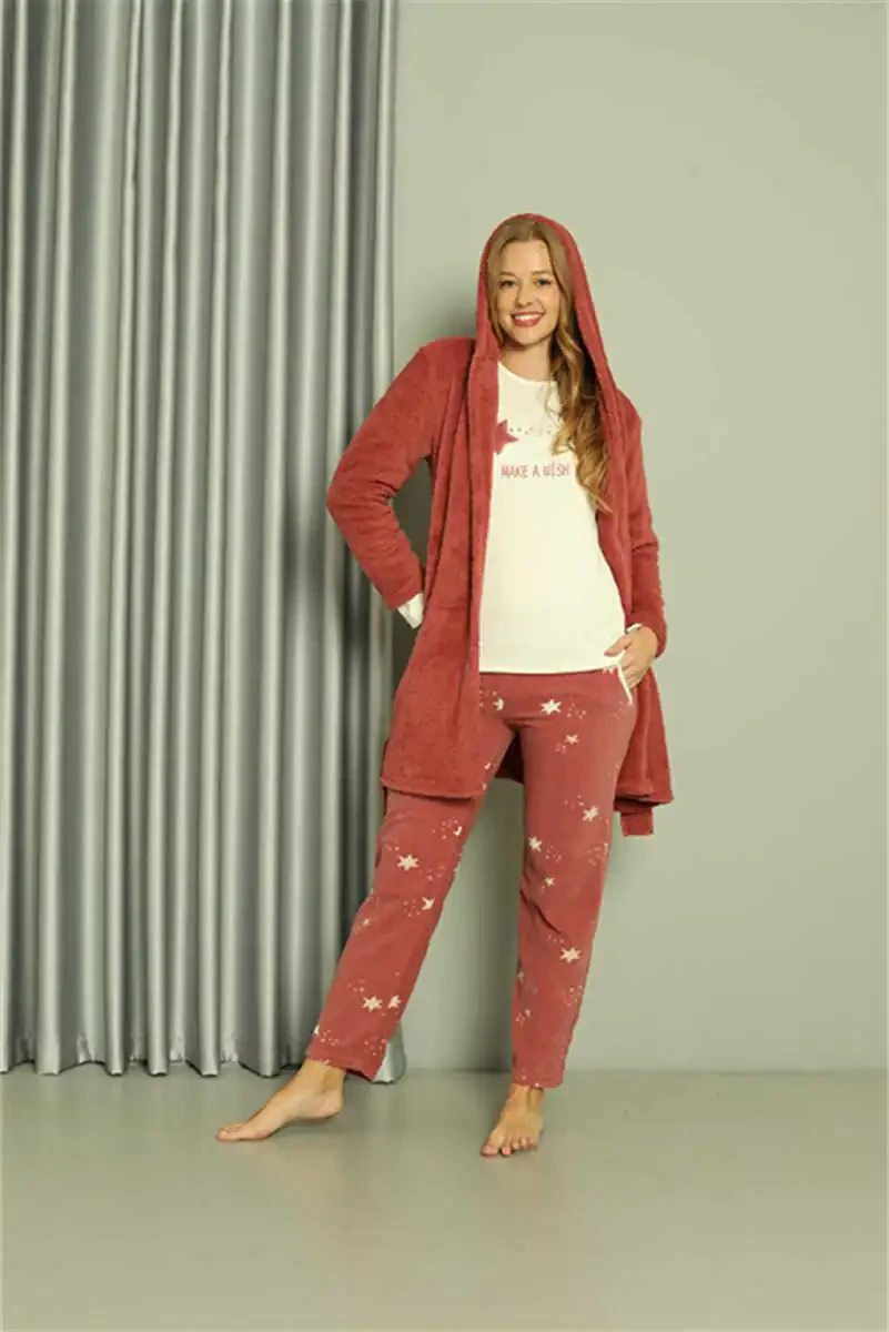 **Akbeniz Welsoft Polar Women's 3-Piece Terracotta Pajama Set 20605**Made from 100% Polyester fabric, the Akbeniz Welsoft Polar Women's 3-Piece Pajama Set is an excellent choice to keep you warm on cold winter days.The product consists of three pieces:* **Pajama Top:** A soft and comfortable pajama top with a cotton inner lining.* **Bottom:** A cozy pajama bottom made of warm polar fabric.* **Hooded Robe:** A plush polar robe with a hood that wraps around your body from head to toe.The set will be shipped within 24 hours. Our model is wearing a size M.**Measurements:**| Size | Bust (cm) | Waist (cm) | Height (cm) | Hips (cm) | Trouser Length (cm) ||---|---|---|---|---|---|| M | 107 | 103 | 86 | 114 | 93 || L | 110 | 106 | 88 | 120 | 95 || XL | 113 | 109 | 90 | 126 | 97 |