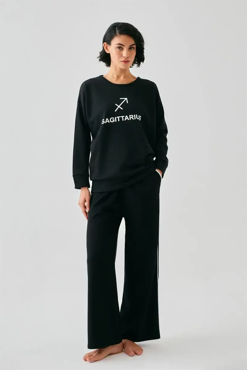 Meet the Akbeniz Women's Black Sagittarius Oversize 2 Thread Tracksuit Home Wear Set. This special design reflects the freedom-loving and adventurous spirit of the Sagittarius zodiac sign while combining comfort and elegance. This set, which will become an indispensable part of your wardrobe, is an ideal choice for both relaxing at home and making a statement with your style. As part of Akbeniz's astrology-themed collection, this tracksuit allows you to carry the energy of your zodiac sign with you. Offering the elegance of black and the comfort of an oversize cut, this set helps you feel good in any environment. Whether you're doing sports, meeting friends, or relaxing at home, you can wear this set. Enjoy comfort without sacrificing your style in any situation. Reflecting the dynamic and positive energy of Sagittarius, this design will add a different dimension to your daily style. It is an excellent choice especially for Sagittarius women who love to travel, are open to new experiences, and are fond of their freedom. Produced with Akbeniz quality, this tracksuit offers long-lasting use. Thanks to the breathable structure of its fabric, it provides comfort throughout the day. The oversize cut does not restrict your freedom of movement and adapts to every body. The minimalist zodiac print adds an elegant touch to the set, while allowing you to personalize your style. This tracksuit is not just a piece of clothing, but also an expression of lifestyle. Choose the Akbeniz Women's Black Sagittarius Oversize 2 Thread Tracksuit Home Wear Set to feel good, reflect your style and not compromise on your comfort. Remember, this set is not just an outfit, but also a tool that reflects your energy and personality. Reflect the adventurous spirit of Sagittarius in your style and enjoy every moment. Experience your freedom and elegance together with Akbeniz.