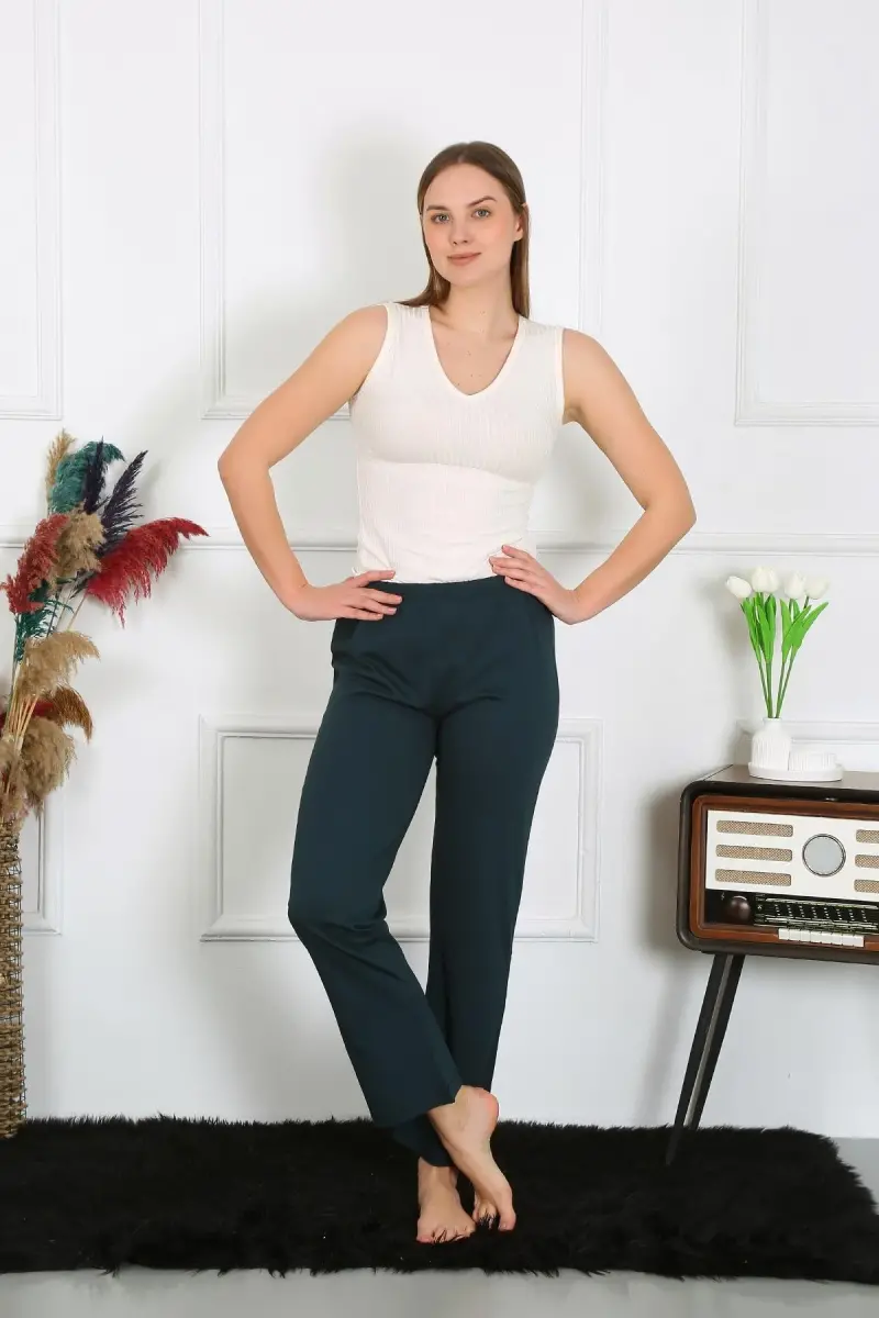 Enjoy comfort and elegance at home with Akbeniz Women's Cotton Jersey Single Bottom Pajamas Petrol 27514. Made of 100% cotton, these single bottom pajamas provide a soft touch to your skin, allowing you to be comfortable all day long. The peaceful and serene atmosphere of the petrol color adds a stylish touch to your loungewear. Produced with Akbeniz quality, these pajamas stand out with their durability and long-lasting use. With its light and breathable structure that makes you feel like you're not wearing anything while resting or sleeping, it prevents sweating in hot weather and keeps you warm in cold weather.Akbeniz Women's Cotton Jersey Single Bottom Pajamas do not restrict your freedom of movement thanks to their comfortable cut. Whether you are relaxing on your sofa while reading a book or doing housework, these pajamas guarantee your comfort all day long. Its modern and simple design can be easily combined with different tops. This way, you can create comfortable and stylish combinations that reflect your own style.Akbeniz continues to offer high-quality and useful products with its years of experience. It brings a new breath to home wear with its designs that prioritize women's comfort and elegance. Akbeniz Women's Cotton Jersey Single Bottom Pajamas Petrol 27514 is a product of this understanding and is a must-have in your wardrobe.The product's body measurements are as follows: hips 116 cm, pant length 98 cm for size M; hips 122 cm, pant length 98 cm for size L; hips 128 cm, pant length 98 cm for size XL; hips 134 cm, pant length 98 cm for size 2XL. The size on the mannequin is size M. You can achieve a perfect fit by choosing the size that suits you best.Akbeniz Women's Cotton Jersey Single Bottom Pajamas Petrol 27514 can be a great gift option for yourself, as well as a meaningful and useful gift for your loved ones. Make your time at home more enjoyable with these pajamas that offer comfort, elegance and quality together.