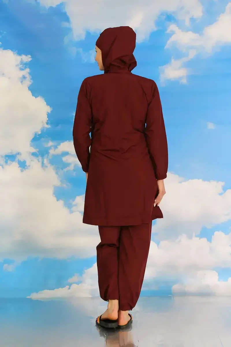 Enjoy the summer while maintaining your elegance and comfort with the Akbeniz Women's Full Coverage Swimsuit Burgundy 31061. This swimsuit, with its modern design and comfort, aims to maximize the enjoyment of the sea and pool for veiled women. This full coverage swimsuit, carrying the elegance of burgundy color, offers long-lasting use thanks to its high-quality material structure. Every detail of this swimsuit, which is carefully designed, attracts attention with both its aesthetic appearance and practical features. Thanks to its waterproof and quick-drying special fabric, it dries quickly after leaving the water, providing you with a comfortable experience. Adjustable elastic clips inside the swimsuit are located both in the waist area and at the leg cuffs. Thanks to these clips, you can ensure that the swimsuit fits your body perfectly, and you can swim and sunbathe comfortably without restricting your freedom of movement. Akbeniz Women's Full Coverage Swimsuit stands out not only for its elegance but also for its ease of use and durability. Thanks to its fabric resistant to sunlight and chlorinated water, it minimizes the risk of encountering problems such as fading and wear. In order to prevent damage to the fabric of the swimsuit, it is important to rinse it thoroughly with plenty of water after each use and avoid contact with rough surfaces. In this way, you can ensure that your swimsuit stays as vibrant and new as the first day. This special design swimsuit consists of a total of 4 pieces. It comes with a full-length bottom trousers, a long-sleeved top and two bonnets (a scarf bonnet and a normal bonnet). Thus, it offers two different bonnet options that you can use according to your headscarf preferences. The size on the mannequin is M, and different size options are available. This swimsuit, which is also available in L, XL and 2XL sizes, is an option that women with different body types can easily prefer. You can easily find the most suitable size for yourself by examining the measurements in the size chart. Akbeniz, as a brand specializing in full coverage swimwear, combines quality and elegance and wins the appreciation of women. This swimsuit is also a special design that reflects the brand's understanding. This swimsuit, which you can easily use both in the pool and in the sea, will be indispensable for your summer vacations. Enjoy swimming comfortably and freely without sacrificing your elegance. Feel special with Akbeniz Women's Full Coverage Swimsuit Burgundy 31061.