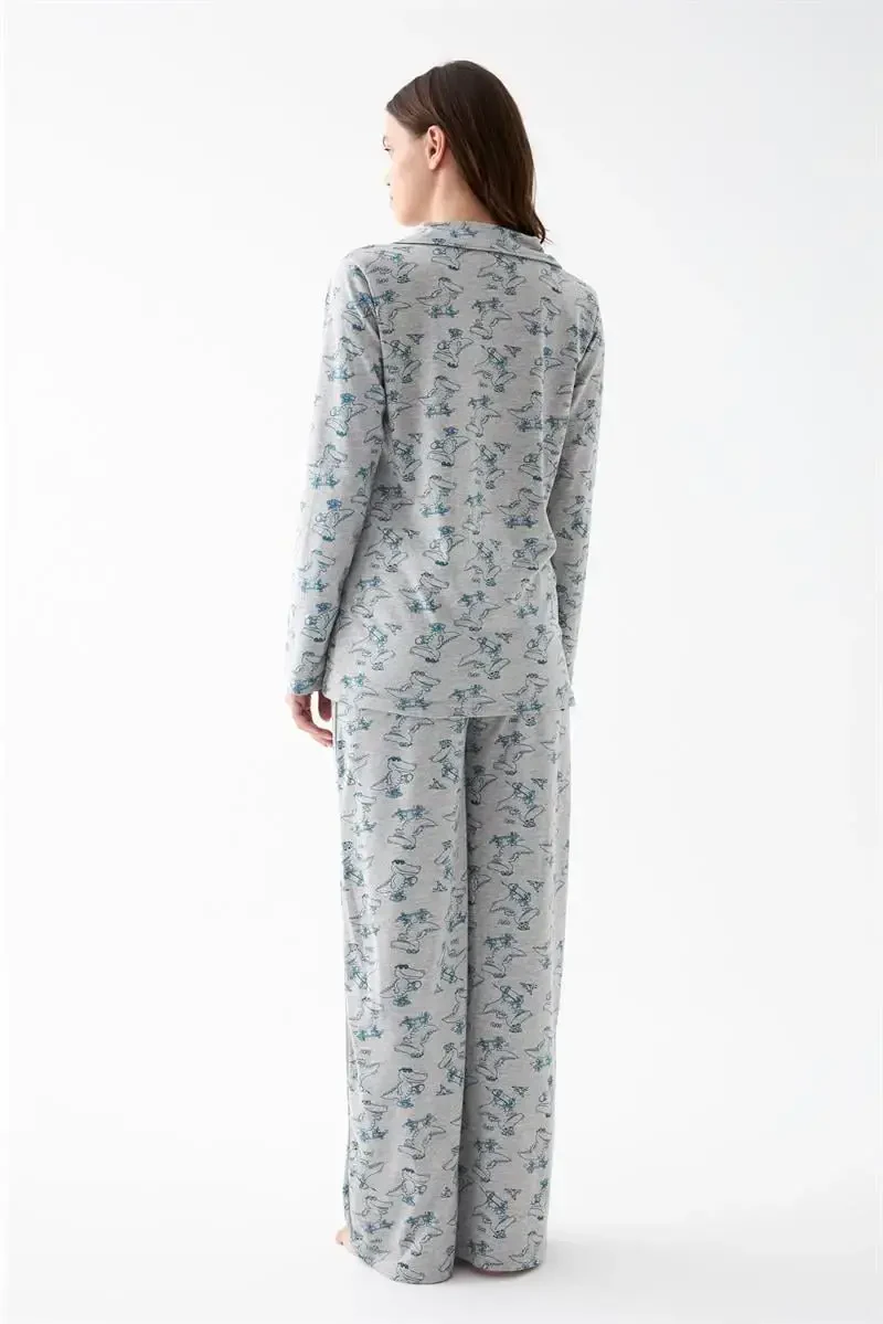 pajama set, women's pajamas, cotton pajamas, gray pajamas, patterned pajamas, button-down pajamas, comfortable pajamas, sleepwear, loungewear, akbeniz pajamas