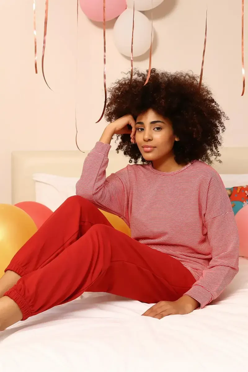 Experience comfort and elegance together with the Akbeniz Women's Long Sleeve 3 Thread Knitted Pajama Set 4184. Made from 100% cotton, this pajama set allows your skin to breathe and offers a comfortable sleep experience with its soft texture. While relieving the tiredness of the day, it also allows you to feel special with its stylish design. The three-thread knitted fabric provides durability and long-lasting use for the pajamas, while also being an ideal choice in cold weather thanks to its warming feature. Akbeniz aims to make the time you spend at home more enjoyable with this pajama set, which it designs by prioritizing women's comfort and elegance. The top of the pajama set is long-sleeved and has a comfortable cut, so it does not restrict your freedom of movement. The bottom part fits your body perfectly thanks to its elastic waistband and provides comfort all day long. Whether you are relaxing at home or hosting guests, Akbeniz pajama set always makes you feel stylish and comfortable. Akbeniz Women's Long Sleeve 3 Thread Knitted Pajama Set offers an alternative suitable for every body type with its different size options. The M size on the mannequin can give you an idea about the general appearance and cut of the product. By choosing the size that suits your measurements from the size chart, you can have a pajama set that fits you perfectly. Akbeniz designs and manufactures each product with care, prioritizing quality and customer satisfaction. This pajama set is also a reflection of Akbeniz quality and elegance. It is an ideal choice for women who love comfort and want to dazzle with their elegance. Order now and experience Akbeniz comfort at your home!