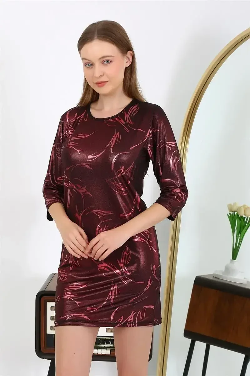 Akbeniz Burgundy Mini Dress | Shiny Micro Fabric Women's Dress