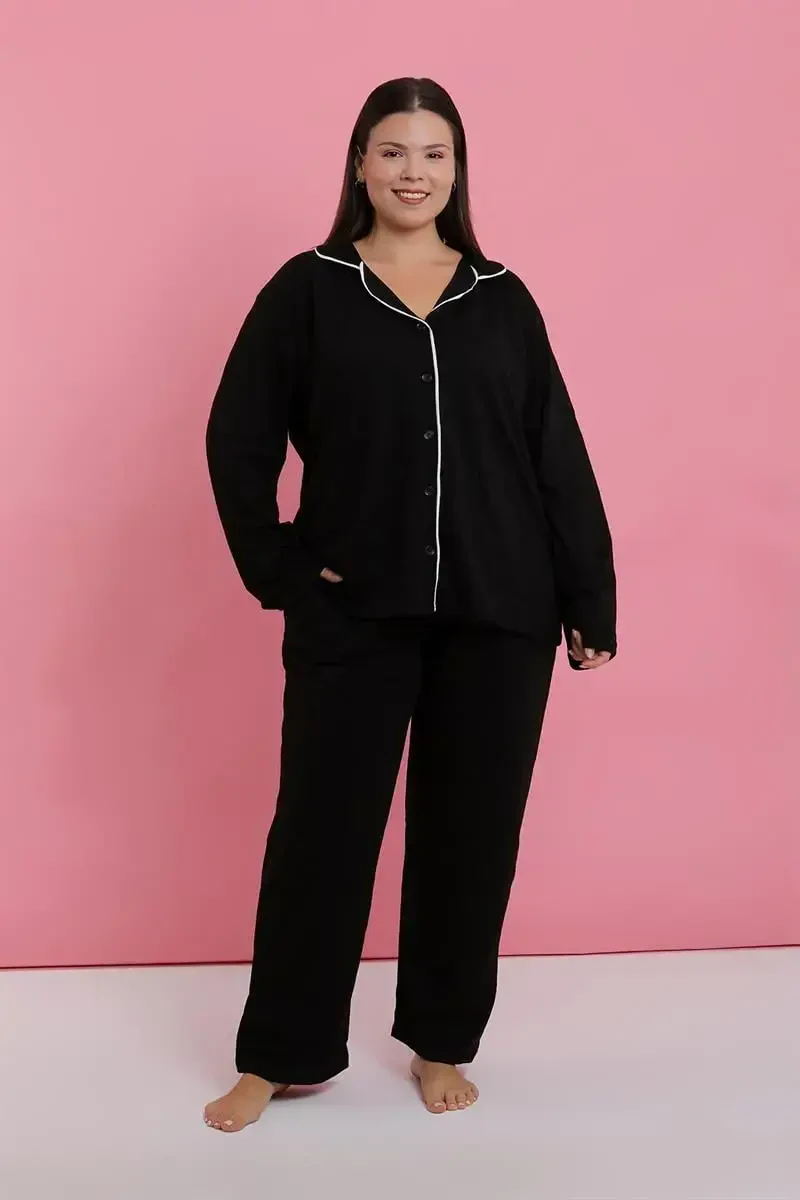 plus size pajamas, women's pajama set, black pajamas, button-down pajamas, cotton pajamas, comfortable pajamas, loungewear, pajama set, akbeniz, plus size clothing