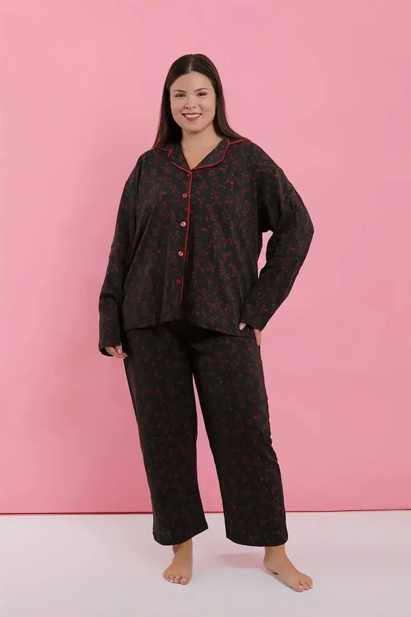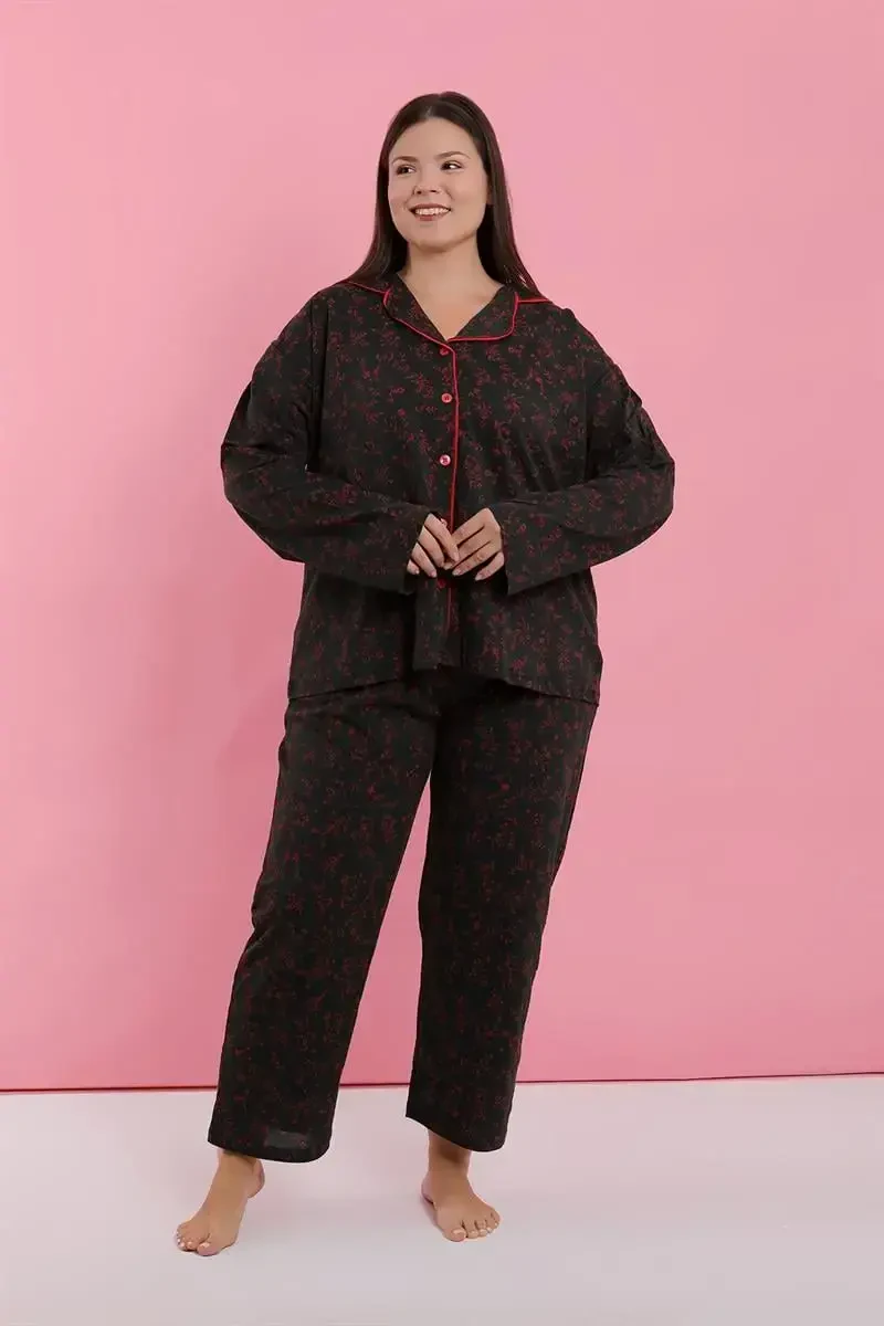 Code: 202523 Experience a comfortable and stylish sleep experience with the Black Akbeniz Women's Plus Size Black Red Floral Buttoned Pajama Set.