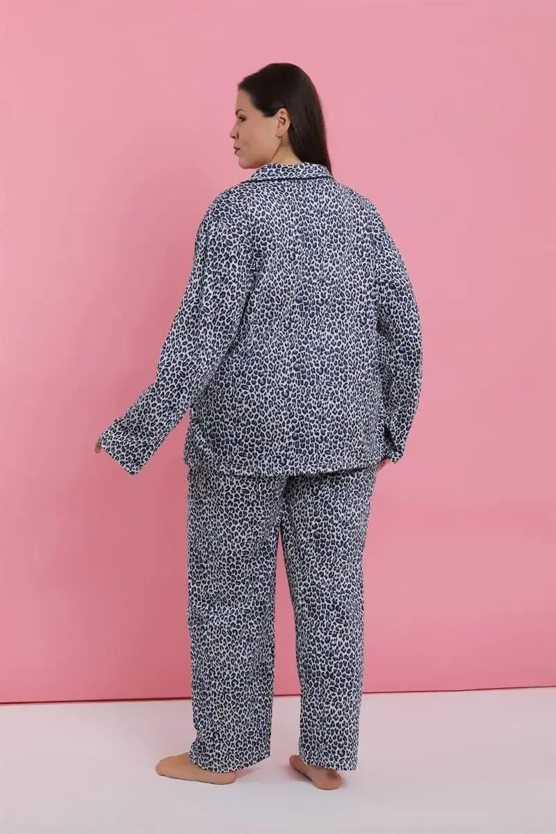 plus size pajama set, women's pajamas, leopard print pajamas, button-down pajamas, cotton pajamas, blue pajamas, loungewear, comfortable pajamas, stylish pajamas, Akbeniz pajamas