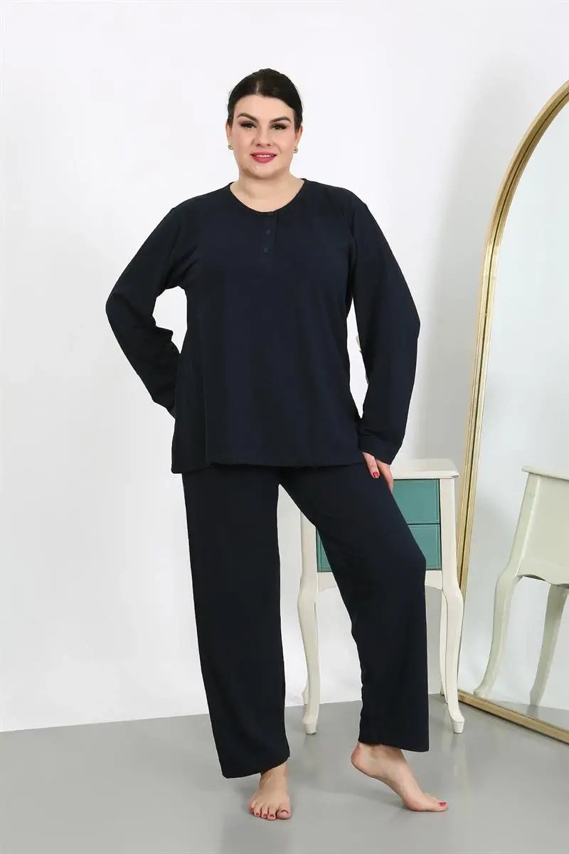 Akbeniz Women's Plus Size Long Sleeve Combed Cotton Pajama Set Navy Blue 202501 is a candidate to be the most indispensable piece of your wardrobe with its special design that combines style and comfort. As one of the most exclusive pieces of the Akbeniz New Big Size Fashion collection, this set is specially produced for women who prioritize quality and aesthetics in plus-size clothing. Its soft combed cotton texture, which provides freedom of movement at home throughout the day, makes your night's sleep more quality and peaceful with its breathable structure for your skin. Combining the nobility of navy blue with modern cut lines, this pajama set offers both a stylish look and ensures that you do not compromise on your comfort. Offering an ideal usage experience during seasonal transitions and cool evenings with its long-sleeved design, our model helps you feel special at any moment with its ergonomic structure that does not tighten the body contours. Bringing a new breath to home wear fashion, this collection maintains its form even in long-term use thanks to its durable fabric structure. Our patterns, which eliminate the difficulties experienced in plus-size clothing, ensure that everyone finds what suits them. The 4XL size on the mannequin best reflects the loose and comfortable structure of the product. Feel the Akbeniz quality in every corner of your home with its modern lines, quality stitching details, and fabric texture that provides ease of use. Whether you are resting or starting the day, this pajama set will be your best companion. Place your order now to have this privileged experience and reflect your style to home comfort.